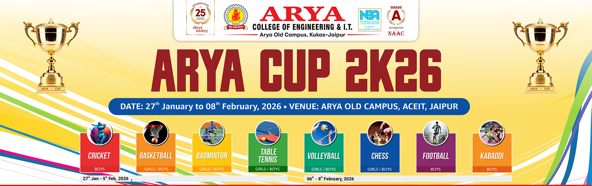 Arya College of Engineering & IT, Jaipur proudly organized Arya Cup 2026, an Inter-College Sports Tournament held from 27th January to 8th February 2026. The event brought together talented athletes from various institutions, turning the campus into a vibrant hub of energy, enthusiasm, and true sportsmanship. Throughout these exciting days, participants competed with great passion and determination in multiple sports, including Cricket, Badminton, Volleyball, Kabaddi, Football, Table Tennis, and Basketball.