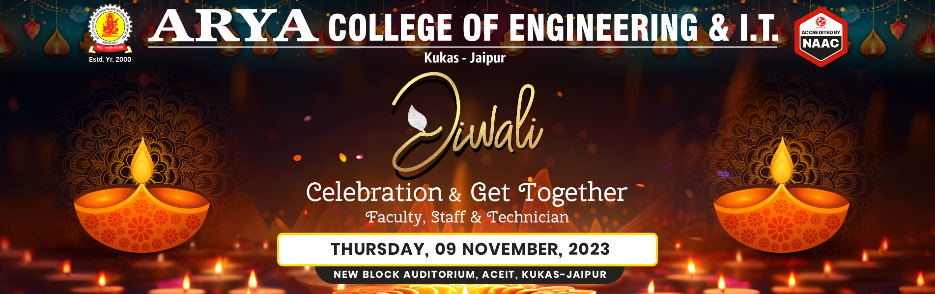 In the spirit of the festival of lights, Arya College of Engineering and IT, Jaipur hosted a spectacular Diwali Celebration and Get-Together on November 9, 2023, bringing together our wonderful faculty, staff, and technicians for an evening of joy and camaraderie. Program unfolded with cultural performances that added a touch of tradition to our celebration. From the mesmerizing beats of music every moment was a celebration of the rich tapestry of our community.