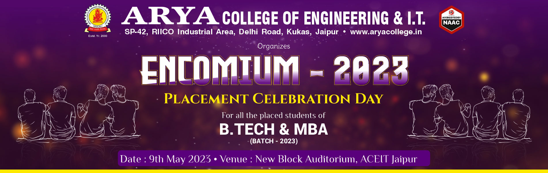 Arya College of Engineering & IT, Jaipur Congratulated and honored the students who have been placed in the session 2022-23. Placement Celebration Day is an important milestone for students, as it marks the beginning of their professional careers. On 9th May 2023 we conducted 'Encomium - 2023' Placement Celebration Day for all the placed students. In this program, we acknowledged and facilitated all the placed students. It is a time to reflect on their accomplishments, to celebrate their success, and to look forward to new challenges and opportunities. We also facilitated student placement coordinators for their hard work. This was really Memorial Day for all the students. Arya College of Engineering & IT, Jaipur wishes you a very bright future and much more success in your career journey.