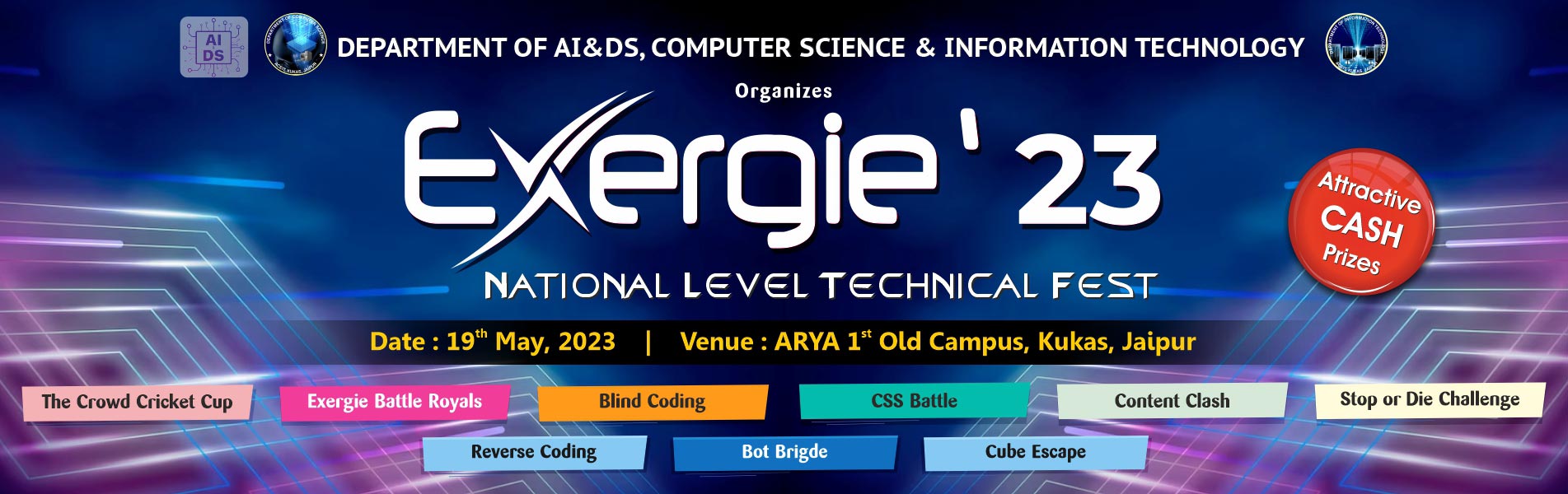 Description: Department of AI & DS, Computer Science & Engineering and Information Technology, Arya College of Engg. & IT. organized Exergie-2023, A Glimpse of Creativity and Innovation, A National Level Tech Fest on 19th May, 2023 in Arya 1st Old Campus. A National Level Tech Fest is a large-scale event that brings together students from various fields of technology to showcase their skills, knowledge, and innovative ideas. We are sure the event will provide the brightest technical minds in the country a platform to showcase and test their skills in various technical competitions, bring them face to face with the latest trends in technology and at the same time have some fun.
