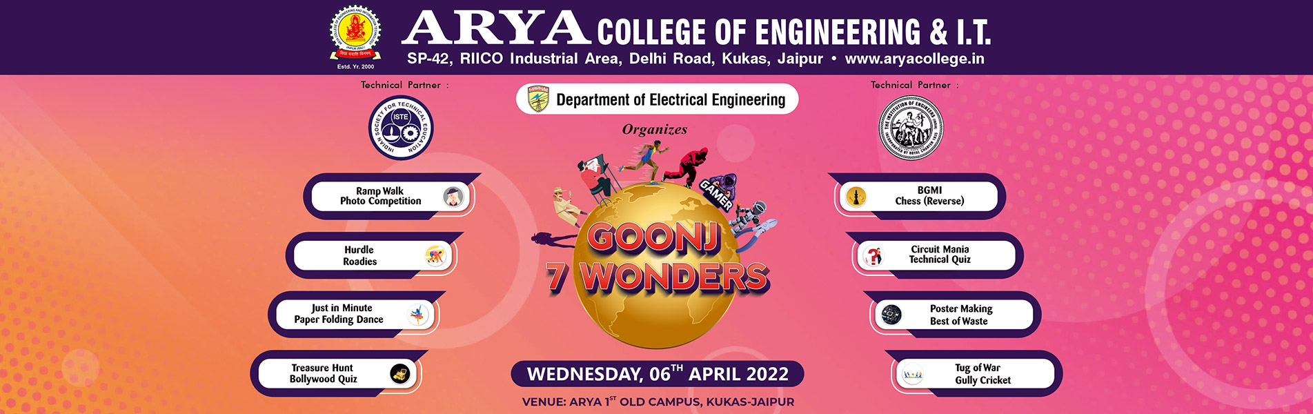 Goonj 2022, a National Level Technical Fest, was successfully organized at Arya 1st Old Campus (Arya College of Engineering and IT). The event provided a vibrant platform where students enthusiastically participated in a variety of activities. This fest aimed to showcase and enhance students' hidden talents and skills across multiple fields, creating an enriching and entertaining experience for all involved.