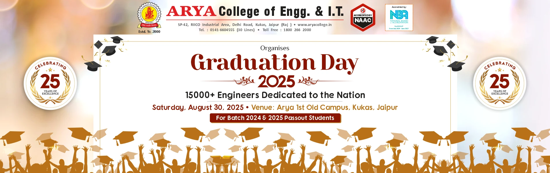 Arya College of Engineering & IT, Jaipur proudly celebrated Graduation Day 2025 on 30th August 2025, marking this significant milestone with the auspicious Lighting of the Lamp Ceremony. The ceremony, rooted in tradition, symbolizes the dispelling of darkness through wisdom and knowledge, and served as a meaningful start to a day dedicated to honoring academic excellence and the journey of our graduating students.