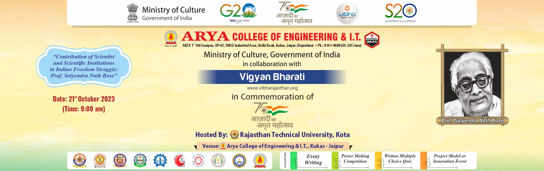 Arya College of Engineering and IT, Jaipur, organized a series of lectures and a program titled “Contribution of Scientists and Scientific Institutions in the Indian Freedom Struggle: Prof. S.N. Bose Memorial Lecture Series” on 21st October, 2023 at Arya 1st Old Campus, Kukas, Jaipur. Students from various schools and engineering colleges came together to participate in essay writing, poster making, quiz competitions, and a fascinating project exhibition, all paying tribute to the invaluable contributions of our scientists to our freedom struggle.