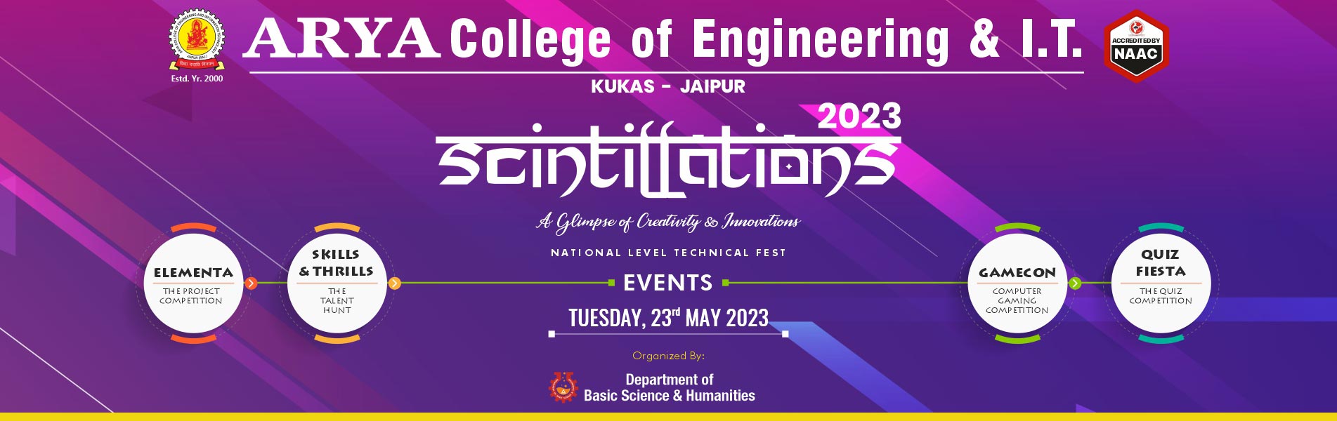 Department of Basic Science & Humanities, Arya College of Engineering & IT, Jaipur organized Scintillations-2023, A National Level Technical Fest on 23rd May, 2023 at Arya 1st Old Campus. In this Tech Fest Elementa (The Project Competition), Skills & Thrills (The Talent Hunt), Gamecon (Computer Gaming Competition) and Quiz Fiesta (The Quiz Competition) activities were conducted. A large number of Students Participated in this tech fest and showcased their talents in different events. The Mega Fest started with lighting the lamp and Saraswati Vandana. Principal Dr. Arun Kumar Arya motivated students about career prospects and technical knowledge. Chairman Er. Anurag Agarwal communicated with the students about their projects, and motivated them for their innovative instincts.