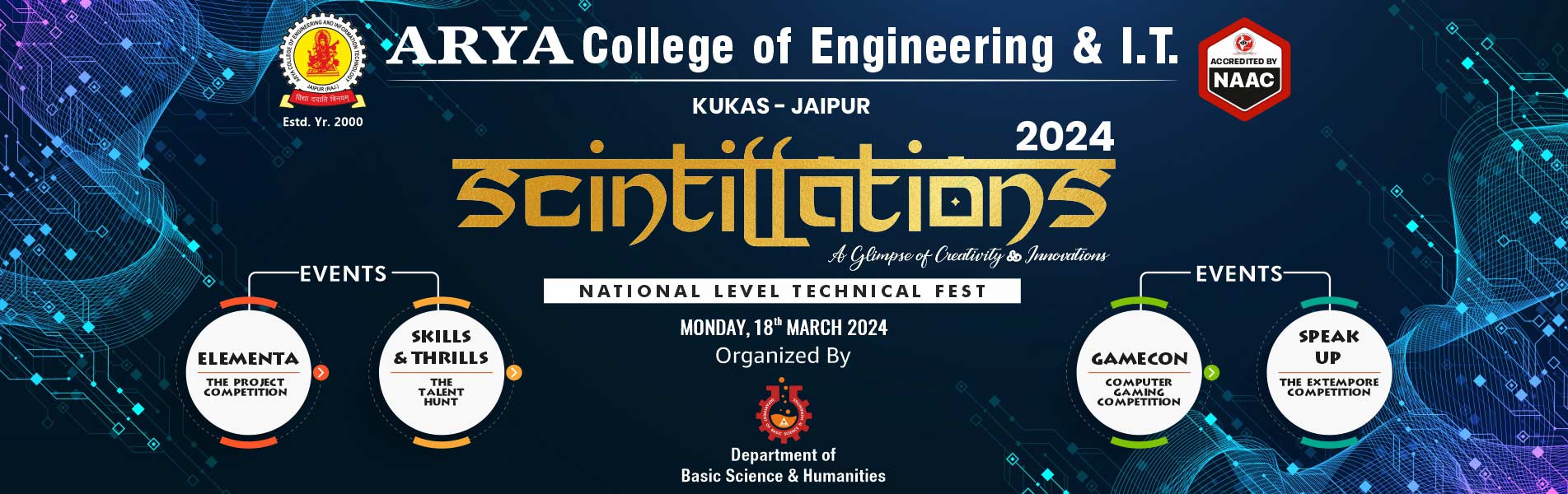 Scintillations 2024 National Level Technical Fest, held at Arya College of Engineering & IT, Jaipur, witnessed a day of spirited competition on 18th March,2024! From Elementa's inventive projects to Skills & Thrills' dazzling talents, students showcased their prowess. Gamecon saw fierce battles in virtual realms, while Speak Up stirred eloquent speeches. Students embraced the challenge, leaving an indelible mark with their ingenuity and passion. Amidst the camaraderie, friendships blossomed, and memories were etched. As the event concluded, participants departed, carrying with them the pride of their achievements and the promise of future endeavors. Until the next Scintillations, the spirit of innovation and competition continues to thrive among the student community!