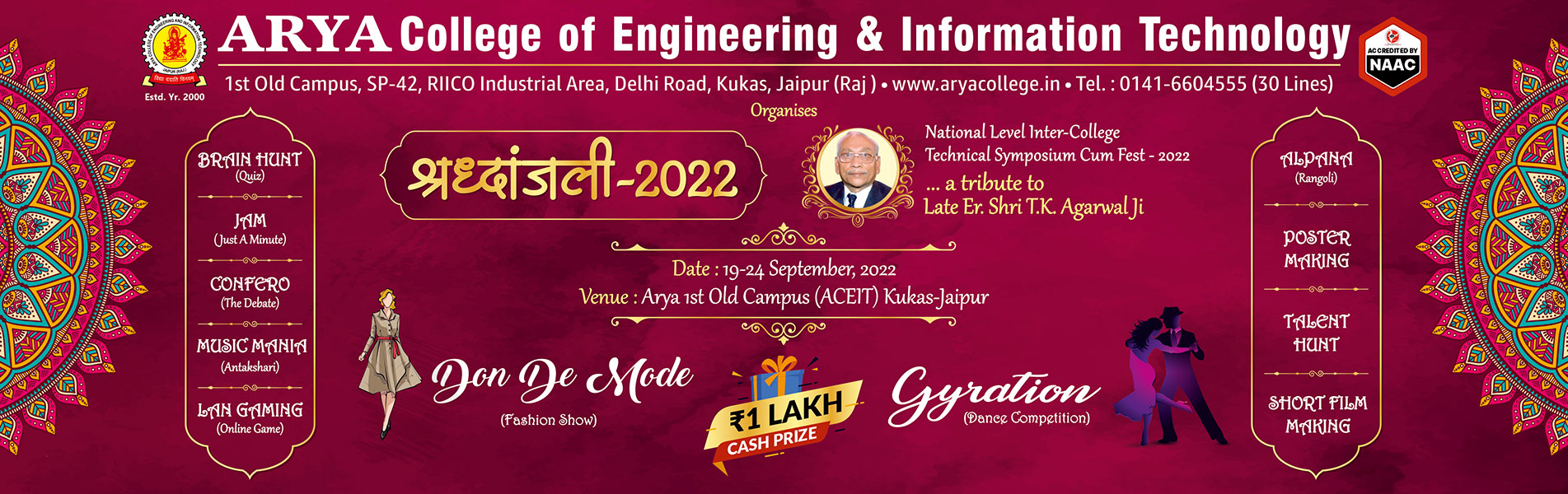 Shradhanjali is a tribute to the founder chairman Late. Shri T.K. Agarwal Ji. This annual National Level Technical Symposium cum Fest bids adieu to the rigorous academic schedule. The event is full of festivity, fun and frolic and fills the students with enthusiasm and a spirit of gaiety. This kind of programme unfalteringly inculcates a spirit of togetherness and team work and develops the organizational capabilities of the students. This fest comprises of various events...
