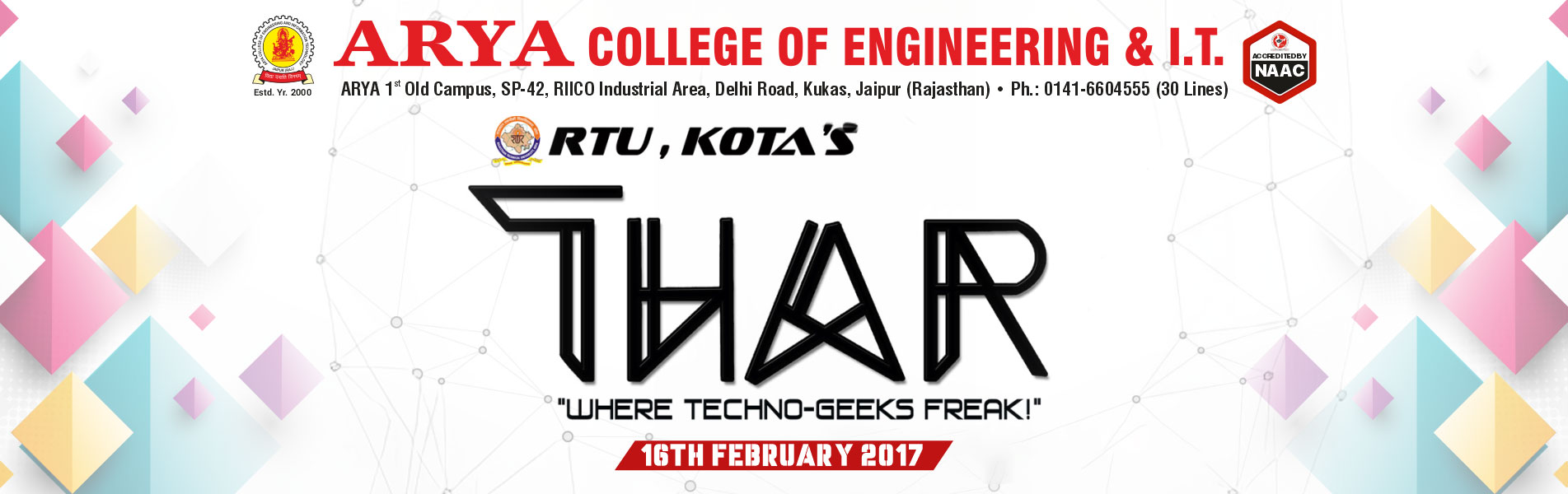 Engineering education requires practical experience and exposure to the growth and development of the individual, society and the nation. There are different events which allow students or aspirants to attain and achieve expertise.THAR embarked with the vision of creating a platform where the future technocrats get to showcase their innovative ideas, it is where theory gets tempered with reality to reach marvels in technology. The event was organized between 16th February 2017.