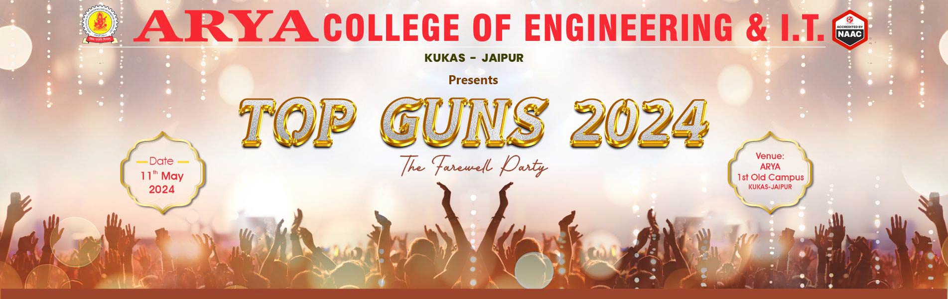 Arya College of Engineering & IT, Jaipur successfully organized Top Guns 2024, a Farewell Party for B.Tech & MBA students, on May 11th, 2024. The event featured a warm welcome for the guests with bouquets and included a series of memorable activities and performances. Students enjoyed an evening filled with heartfelt speeches, and musical entertainment, celebrating their accomplishments and friendships. The farewell party was a fitting tribute to the hard work and dedication of the graduating class, leaving them with cherished memories as they embark on their future endeavors.