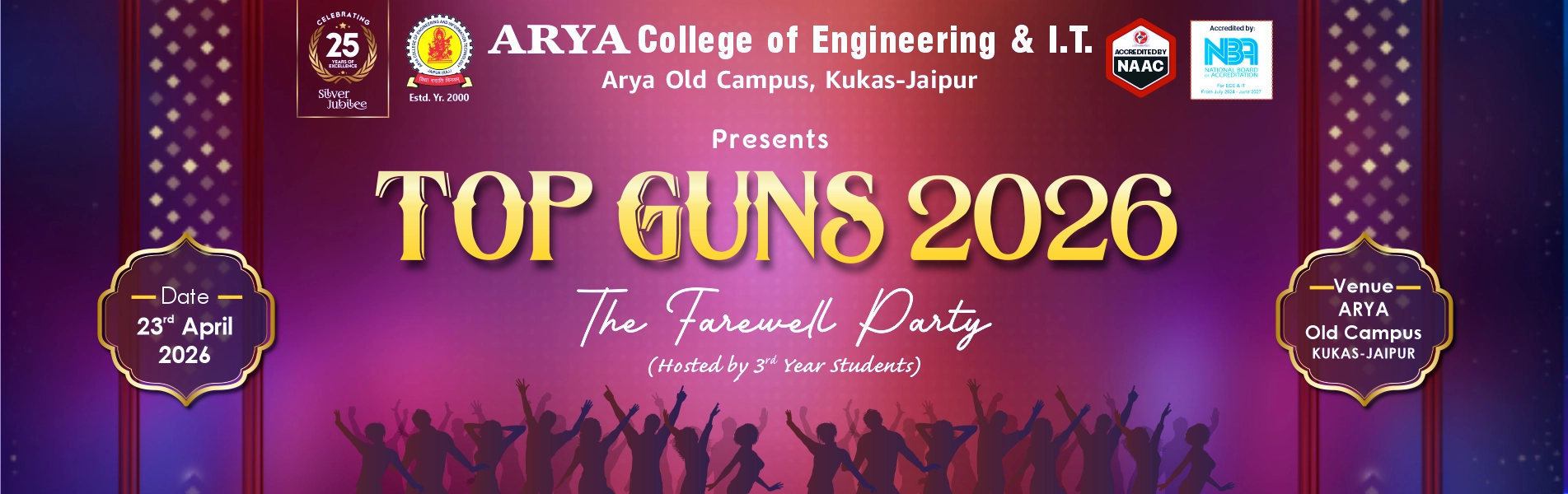 Arya College of Engineering & IT, Jaipur proudly organized Top Guns 2026 – The Farewell Party on 23rd April 2026, creating a truly unforgettable evening dedicated to celebrating the journey of its graduating students. A memorable evening celebrating the journey and accomplishments of our graduating batch. As they step forward into new opportunities, we wish them continued success and a bright future ahead.