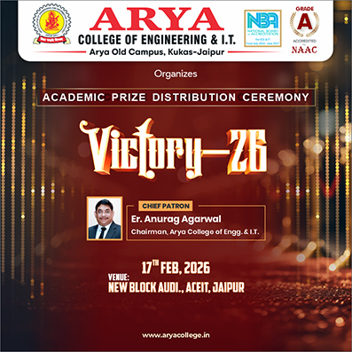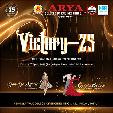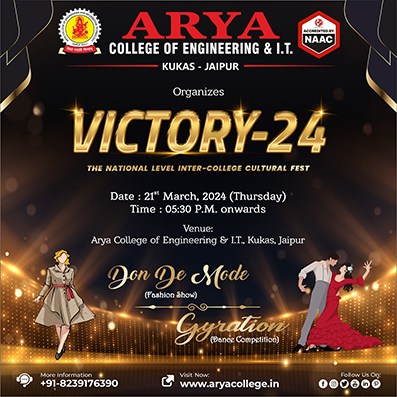 The Arya College of Engineering and IT, celebrates Victory - The Annual Day Celebration and Prize Distribution event at Arya 1st Old Campus. The program begins with the “Saraswati Vandana” and a special welcome song has been sung by the college students. The most interesting part of the event is the cultural programme prepared by the students that include Dance, Ramp Walk, Live Band and various others.