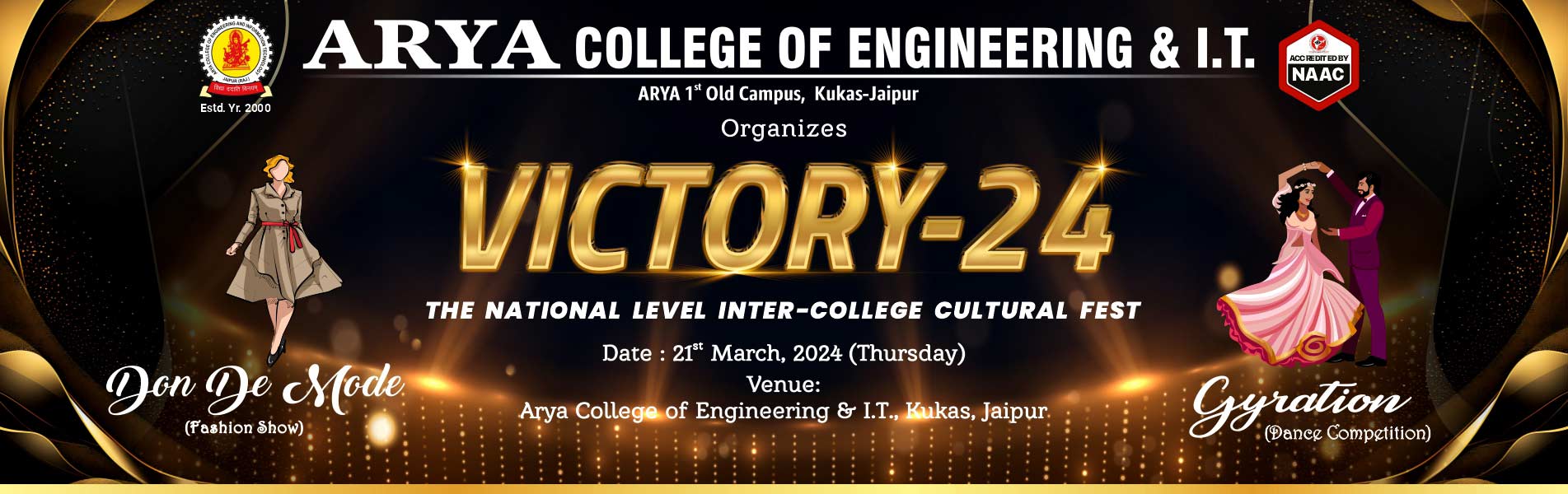 The month of March 21st marked an extraordinary day as Arya College of Engineering & IT hosted Victory-24, a National Level Inter-College Cultural Fest that left everyone spellbound! Alongside mesmerizing performances and inspiring exhibits, the ramp sizzled with style as participants strutted their stuff in an electrifying fashion show. From elegant couture to avant-garde designs, the ramp walk added a touch of haute couture to the cultural extravaganza. A huge round of applause to all the runway stars who brought their A-game, making the ramp walk a highlight of Victory 2024.