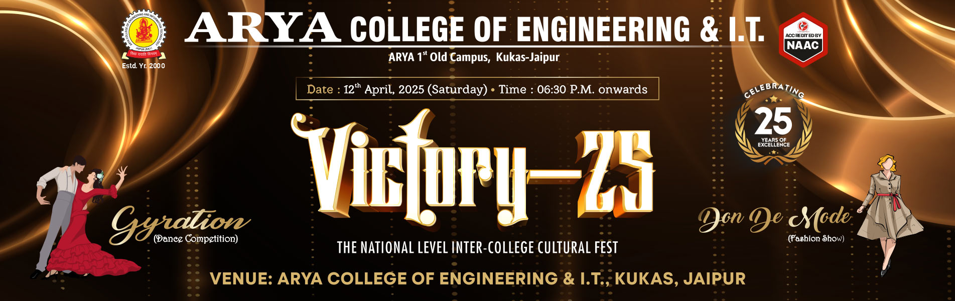April 15th was a spectacular day at Arya College of Engineering & IT as the campus came alive with Victory-25, a National Level Inter-College Cultural Fest featuring Don De Mode and Gyration. The event brought together creativity, energy, and talent from across the nation, leaving the audience truly spellbound. With captivating performances and thought-provoking exhibits, the fest showcased the vibrant spirit of youth and cultural diversity. The highlight of the day was the electrifying fashion show, where participants lit up the ramp with confidence, flair, and unique styles. Equally thrilling was the dynamic dance competition that had the crowd cheering for every beat and move. From graceful twirls to high-octane choreography, the energy was infectious. Victory-25 proved to be more than just a cultural celebration—it was a dazzling fusion of art, expression, and competitive spirit, making it a truly unforgettable experience for participants and spectators alike.