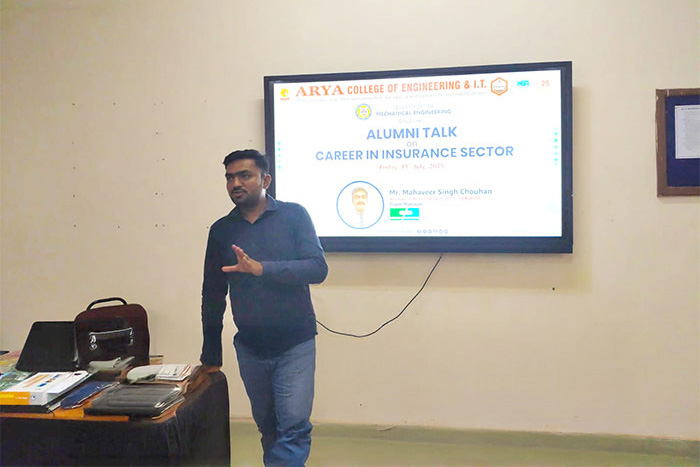 The Department of Mechanical Engineering at Arya College of Engineering & IT, Jaipur, proudly hosted an engaging Alumni Talk on "Career in the Insurance Sector" on 11th July 2025. The session featured our esteemed alumnus Mr. Mahaveer Singh Chauhan (B.Tech, Batch 2010–14), who is currently serving as Claim Manager at IFFCO TOKIO.