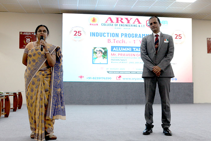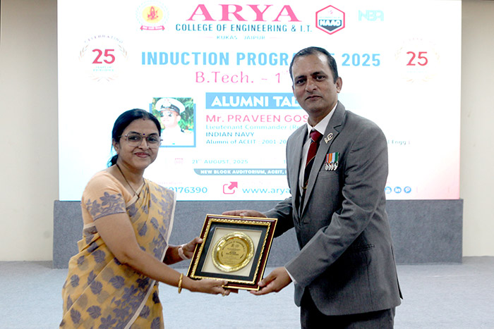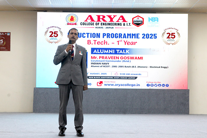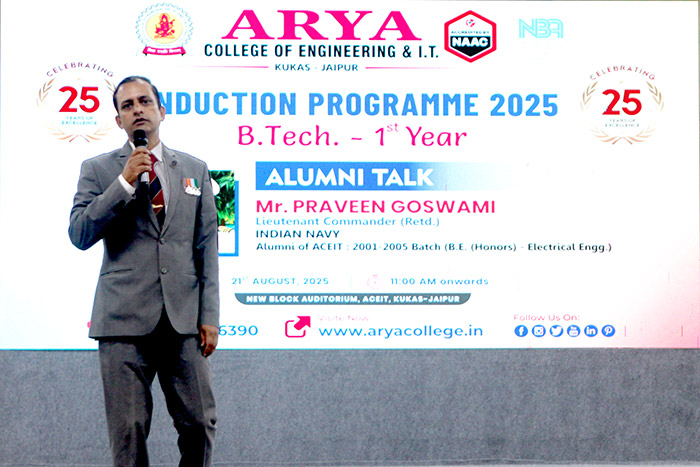 Arya College, Jaipur, had the honor of hosting an inspiring Alumni Talk on 21st August 2025, by Mr. Praveen Goswami, Lieutenant Commander (Retd.), Indian Navy and a proud alumnus of ACEIT (Batch 2001–2005, Electrical Engineering).