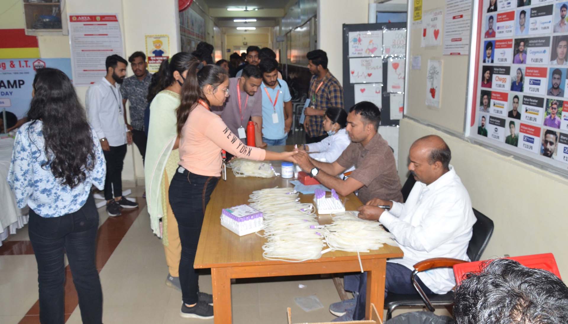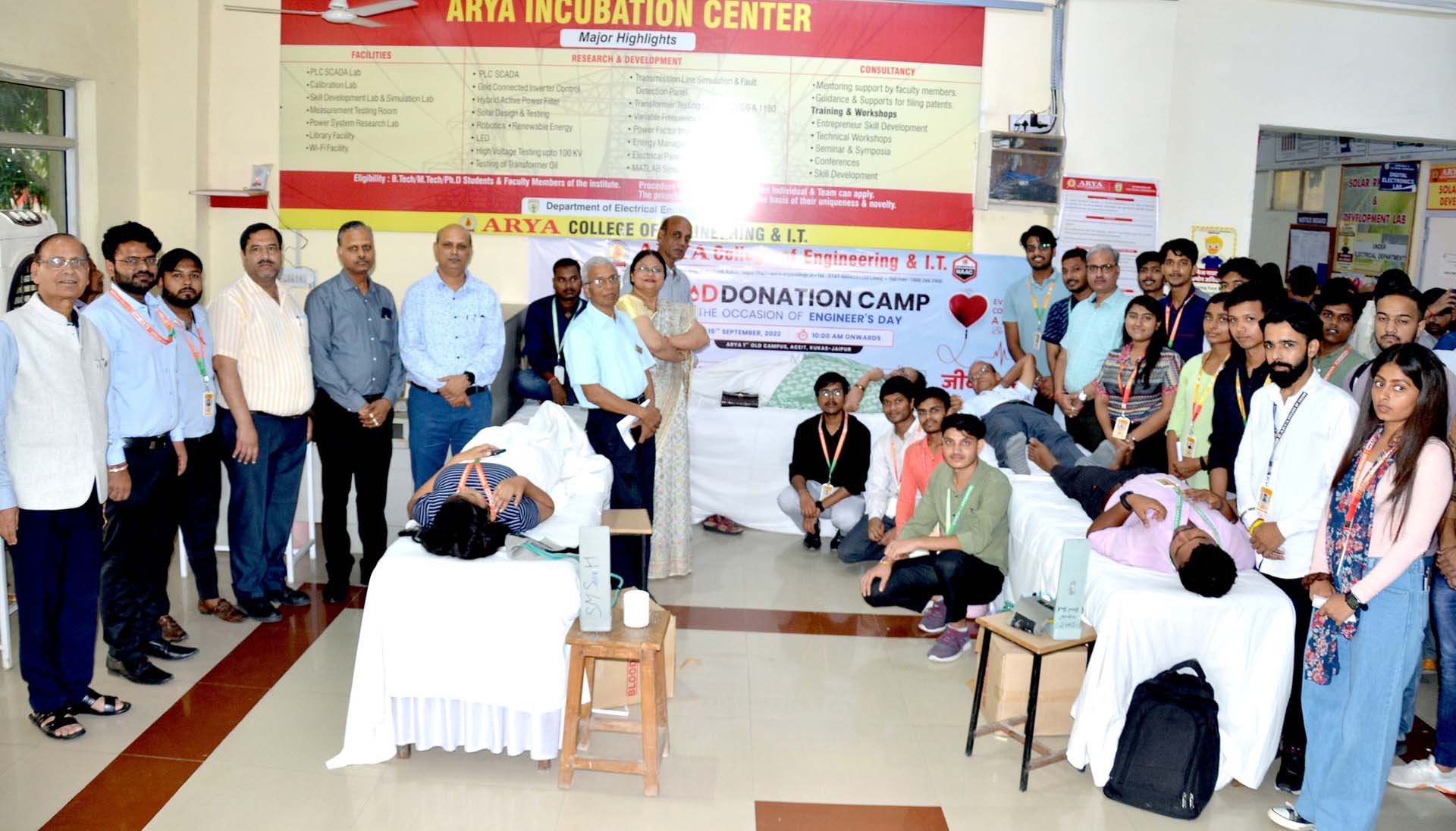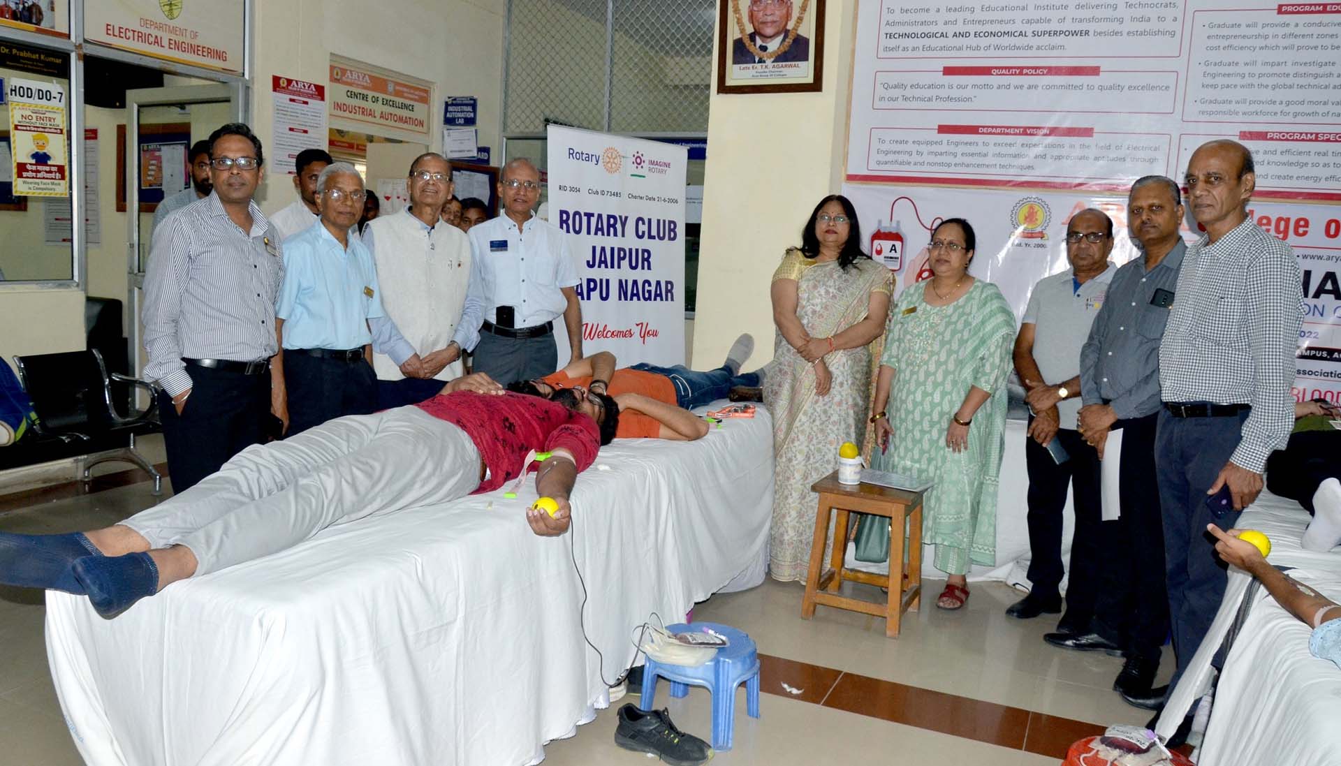 Arya College of Engineering & IT, Jaipur organized its Annual Blood Donation Camp on September 15, 2022, in collaboration with SMS Hospital, Jaipur. A dedicated team of doctors and lab technicians from Sawai Man Singh (SMS) Hospital visited the campus, inspiring students, faculty, and staff to contribute to this noble cause. The event witnessed an overwhelming response, with the Arya family donating 234 units of blood. Chairman Er. Anurag Agarwal and Principal Dr. Arun Arya graced the occasion, appreciating the donors and encouraging everyone to continue supporting such life-saving initiatives.