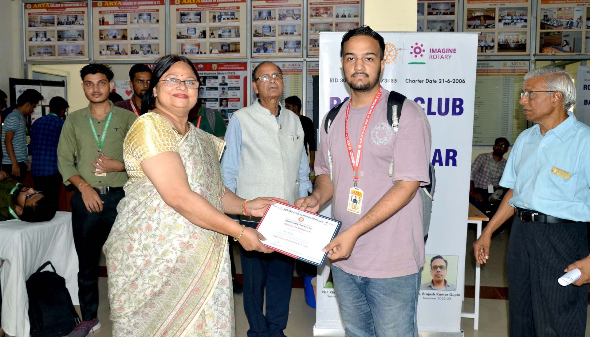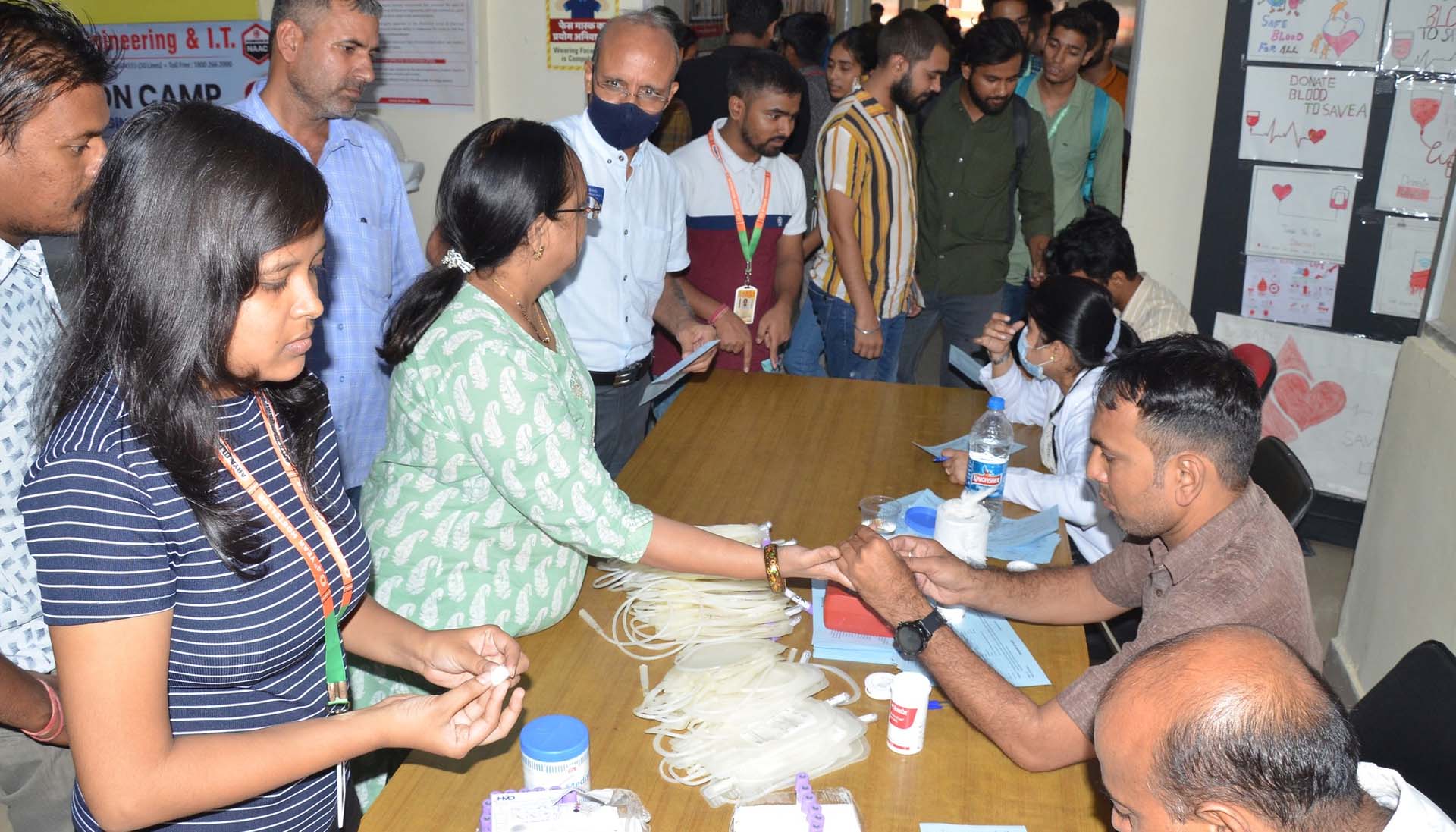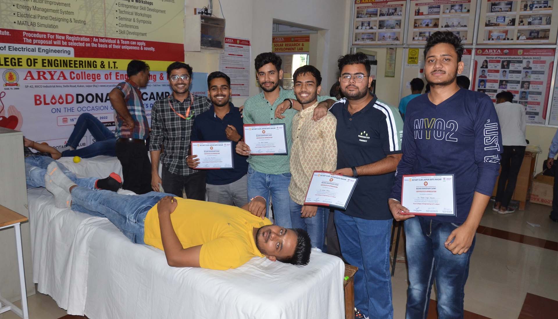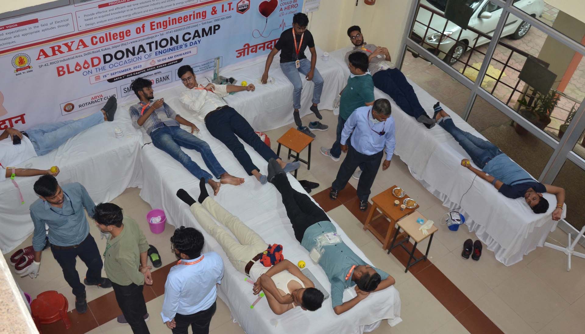 Arya College of Engineering & IT, Jaipur organized its Annual Blood Donation Camp on September 15, 2022, in collaboration with SMS Hospital, Jaipur. A dedicated team of doctors and lab technicians from Sawai Man Singh (SMS) Hospital visited the campus, inspiring students, faculty, and staff to contribute to this noble cause. The event witnessed an overwhelming response, with the Arya family donating 234 units of blood. Chairman Er. Anurag Agarwal and Principal Dr. Arun Arya graced the occasion, appreciating the donors and encouraging everyone to continue supporting such life-saving initiatives.
