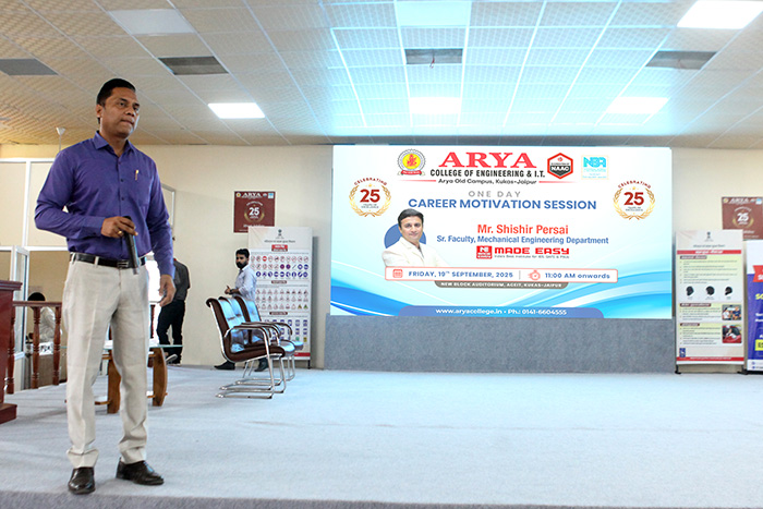 Arya College of Engineering & IT, Jaipur, successfully conducted a highly engaging One-Day Motivational Session on 19th September 2025. The session was led by Mr. Shishir Persai, Senior Faculty from the Department of Mechanical Engineering at Mage Easy, who captivated the audience with his powerful words and inspiring delivery.