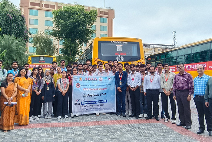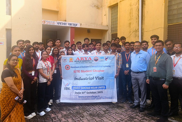 The Department of Electronics & Communication Engineering, Arya College of Engineering & IT, Jaipur, in collaboration with the IETE Student Chapter, organized an Industrial Visit to Bharat Sanchar Nigam Limited (BSNL) on 7th October 2025. The visit provided students with an excellent opportunity to explore the practical aspects of telecommunication systems, network operations, and the advanced communication technologies implemented by BSNL. Experts at BSNL shared valuable insights into the functioning of switching, transmission, and broadband networks, helping students connect theoretical learning with real-world applications.