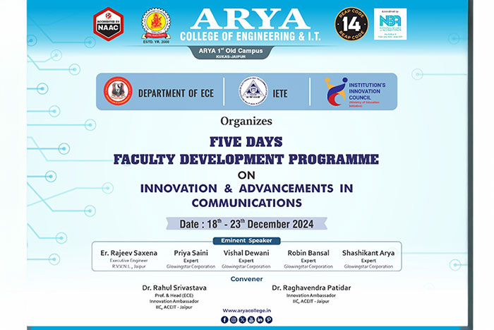 The Department of Electronics & Communication Engineering, in collaboration with the Institution's Innovation Council at Arya College of Engineering & IT, Jaipur, is organizing a Five-Day Faculty Development Program (FDP) on "Innovation & Advancements in Communications" from 18th to 23rd December 2024.