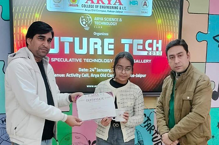 Future Tech 2050 – A Speculative Technology Poster Gallery was successfully organized by the Arya Science & Technology Club, Arya College of Engineering & IT, Jaipur, under Tech Saturday on 24th January 2026. The event provided a creative platform for students to present visionary ideas and futuristic technological concepts through impactful poster presentations. Participants demonstrated remarkable imagination, innovation, and analytical thinking while exploring technologies of the future.