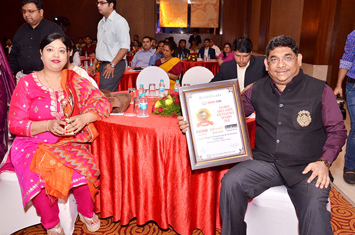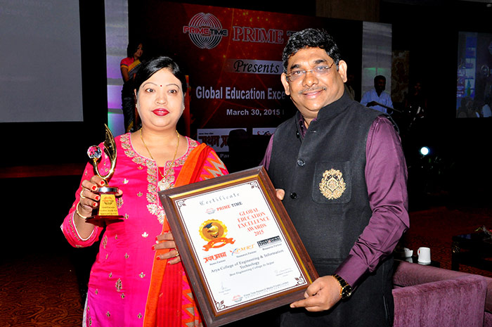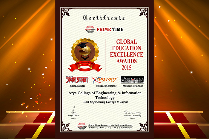 Arya College of Engineering & I.T. (ACEIT), Jaipur, was honored with the prestigious Global Education Excellence Award in 2015 by Prime Time Research Media Private Limited. This esteemed recognition highlights the college’s outstanding contribution to the field of education, showcasing its unwavering commitment to innovation, creativity, and academic excellence. The award was presented by prominent dignitaries—Shri Kirti Azad, renowned former cricketer and Member of Parliament, and Shri Anand Kumar, the visionary founder and director of Super 30—who graced the occasion as Guests of Honor. ACEIT’s consistent efforts to enhance the quality of technical education, along with its student-centric approach and advanced academic environment, earned it this remarkable distinction. The institution continues to set new benchmarks in the educational landscape through its progressive initiatives, research-driven teaching methodologies, and industry-aligned training programs. This award stands as a testament to the college's dedication to shaping future-ready professionals and leaders in the engineering domain.
