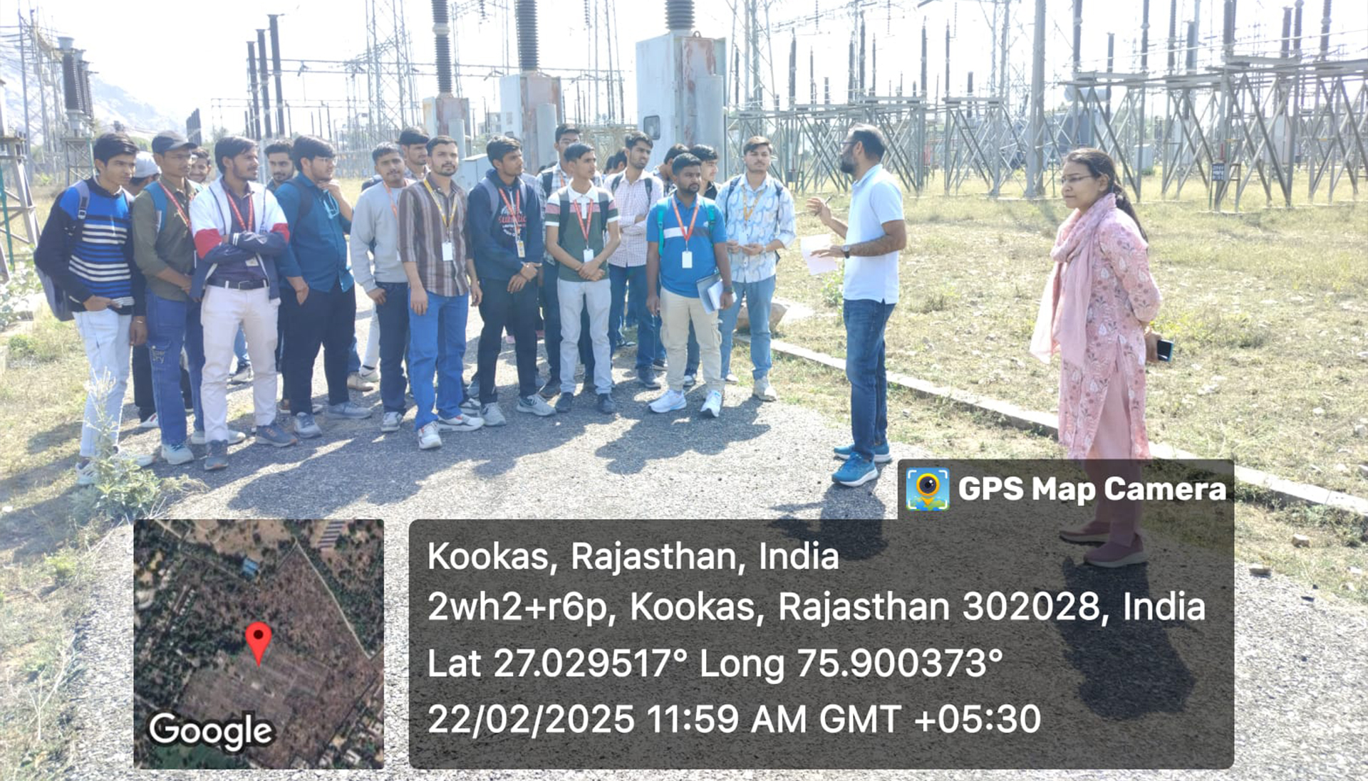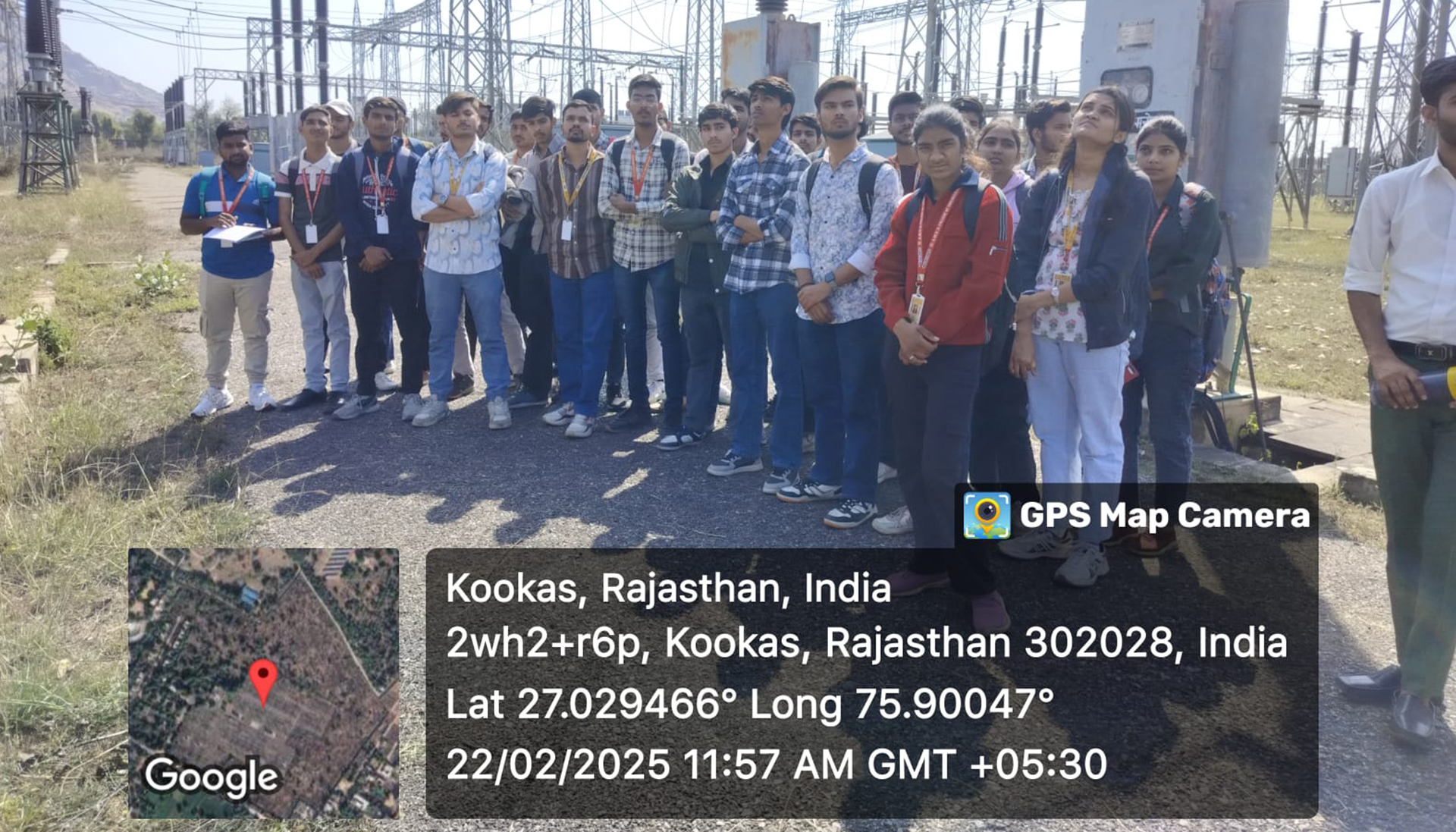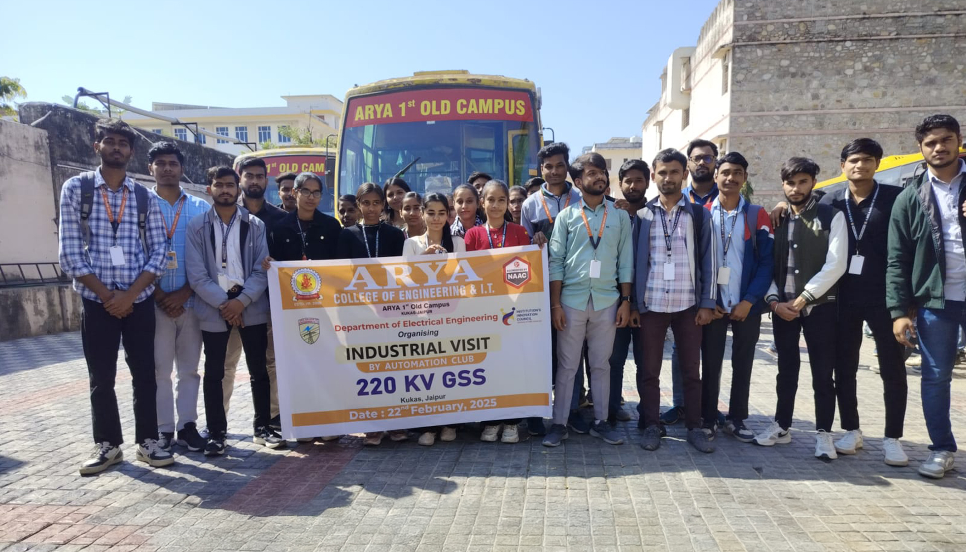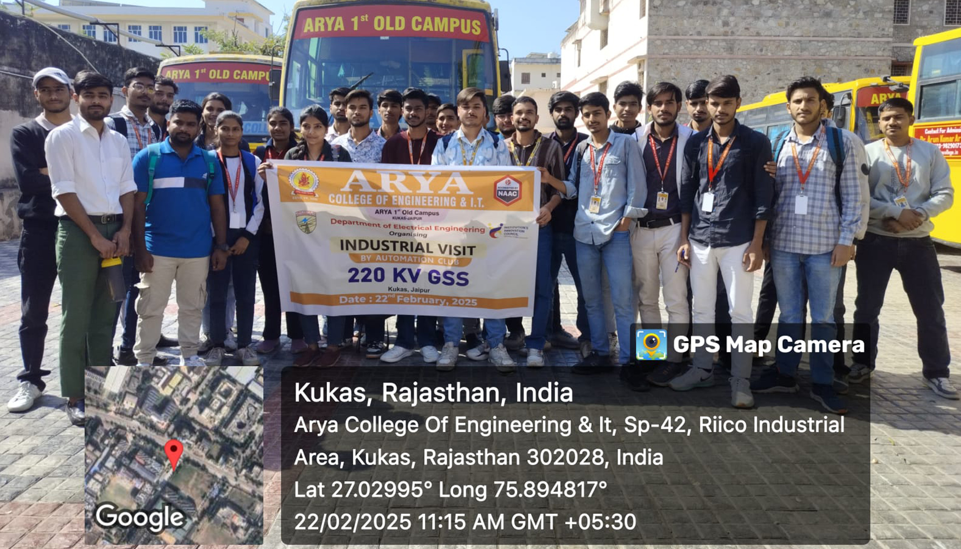 The Department of Electrical Engineering at Arya College of Engineering & IT, Jaipur, organized a One-Day Industrial Visit to the 220 KV Grid Substation (GSS) in Kukas, Jaipur, on 22nd February 2025, under the Arya Automation Club. This visit provided students with a valuable opportunity to gain practical insights into high-voltage power transmission, substation operations, and electrical automation.
