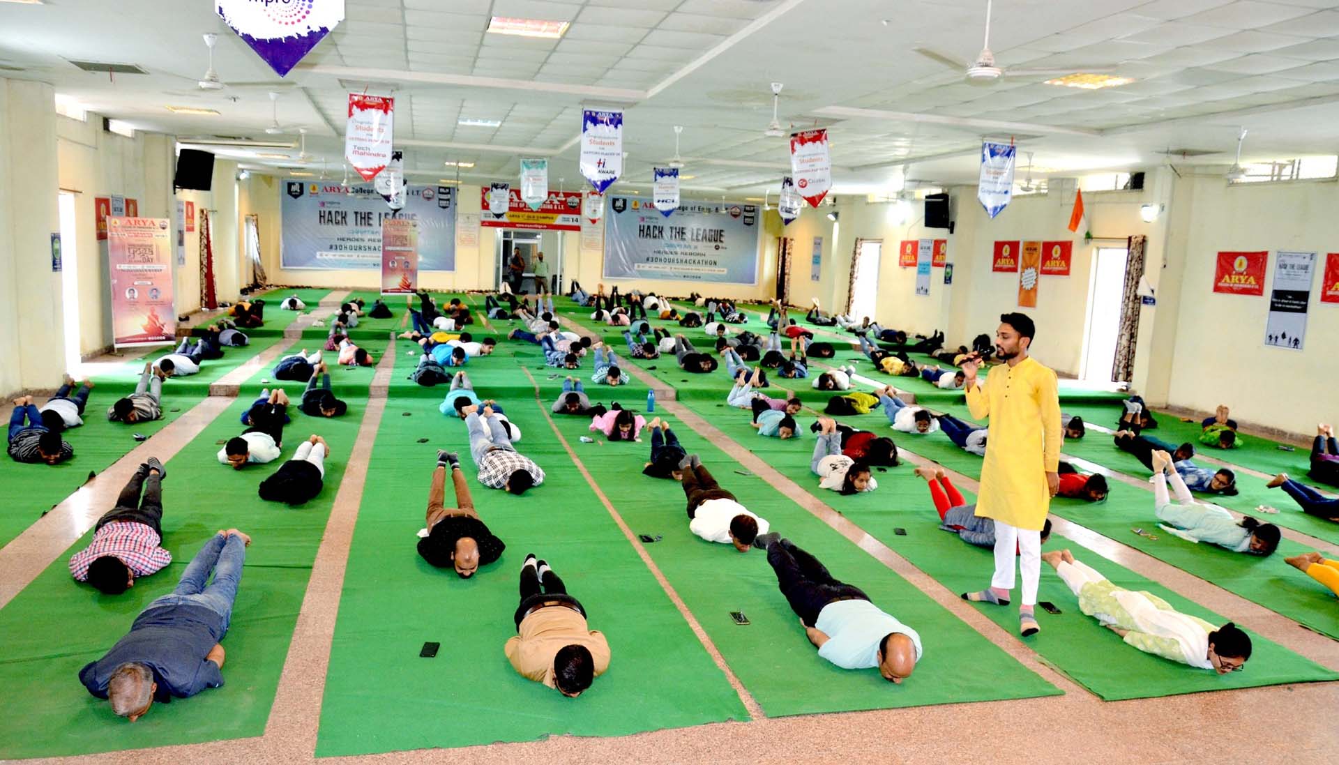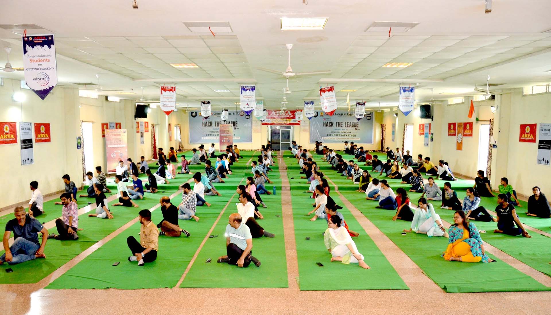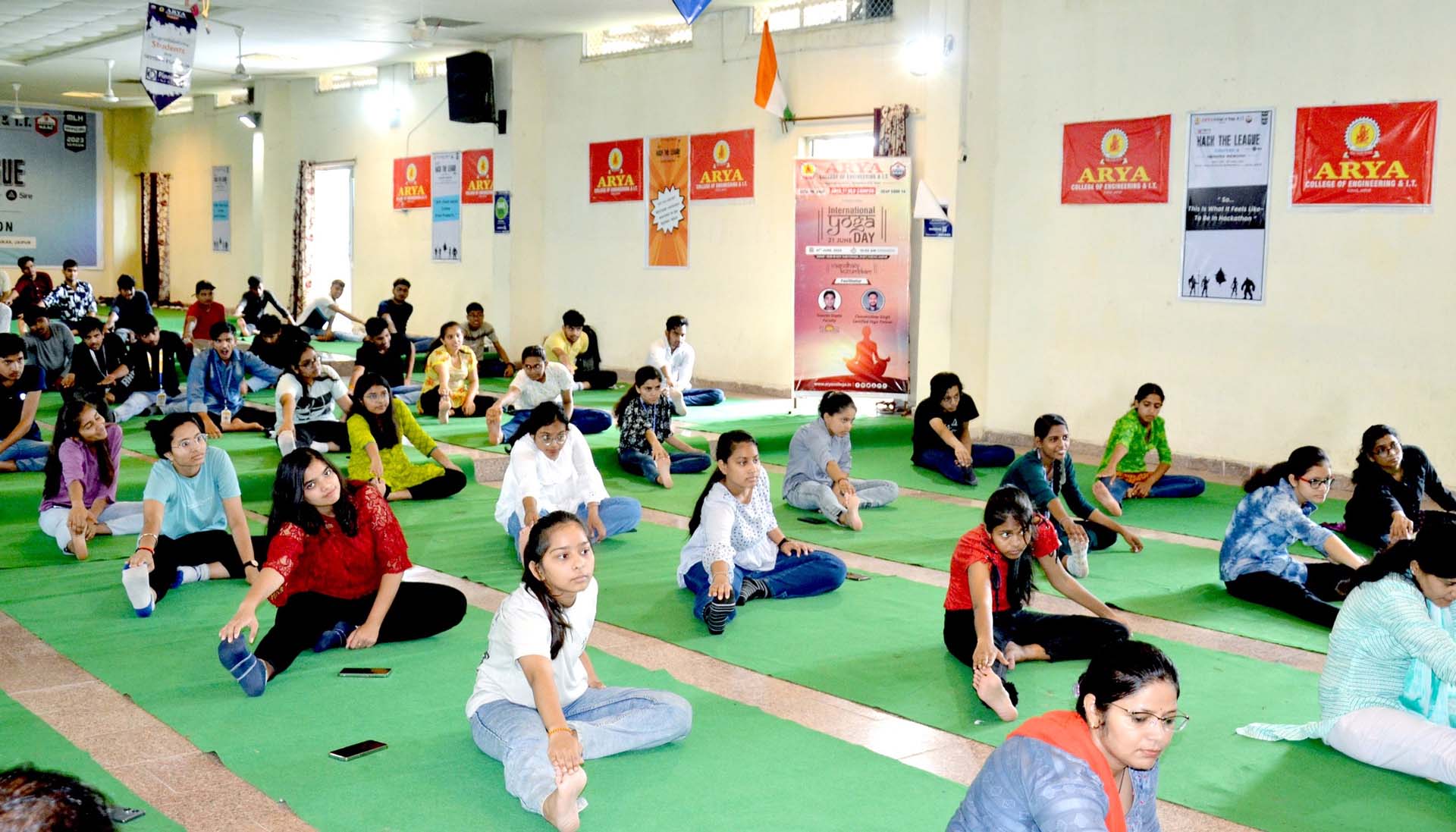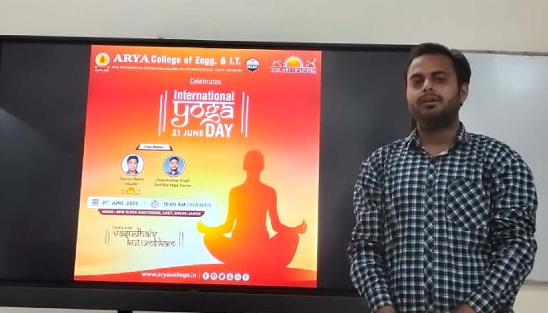 On International Yoga Day 2023, Arya College of Engineering & IT, Jaipur celebrated the occasion with the theme Vasudhaiva Kutumbakam at the Arya 1st Old Campus, 21st June 2023. A special class activity was conducted to raise awareness about yoga and its benefits. Students actively participated, performing various standing yoga postures to improve posture, motor skills, and balance.