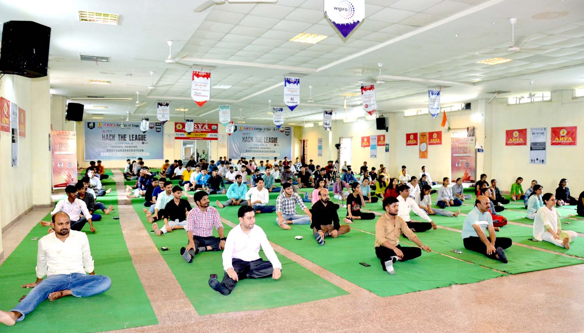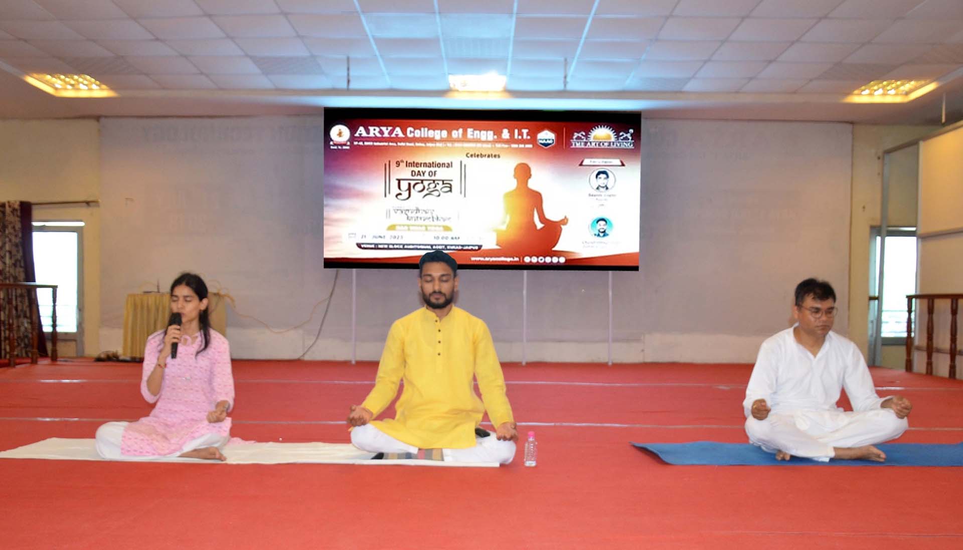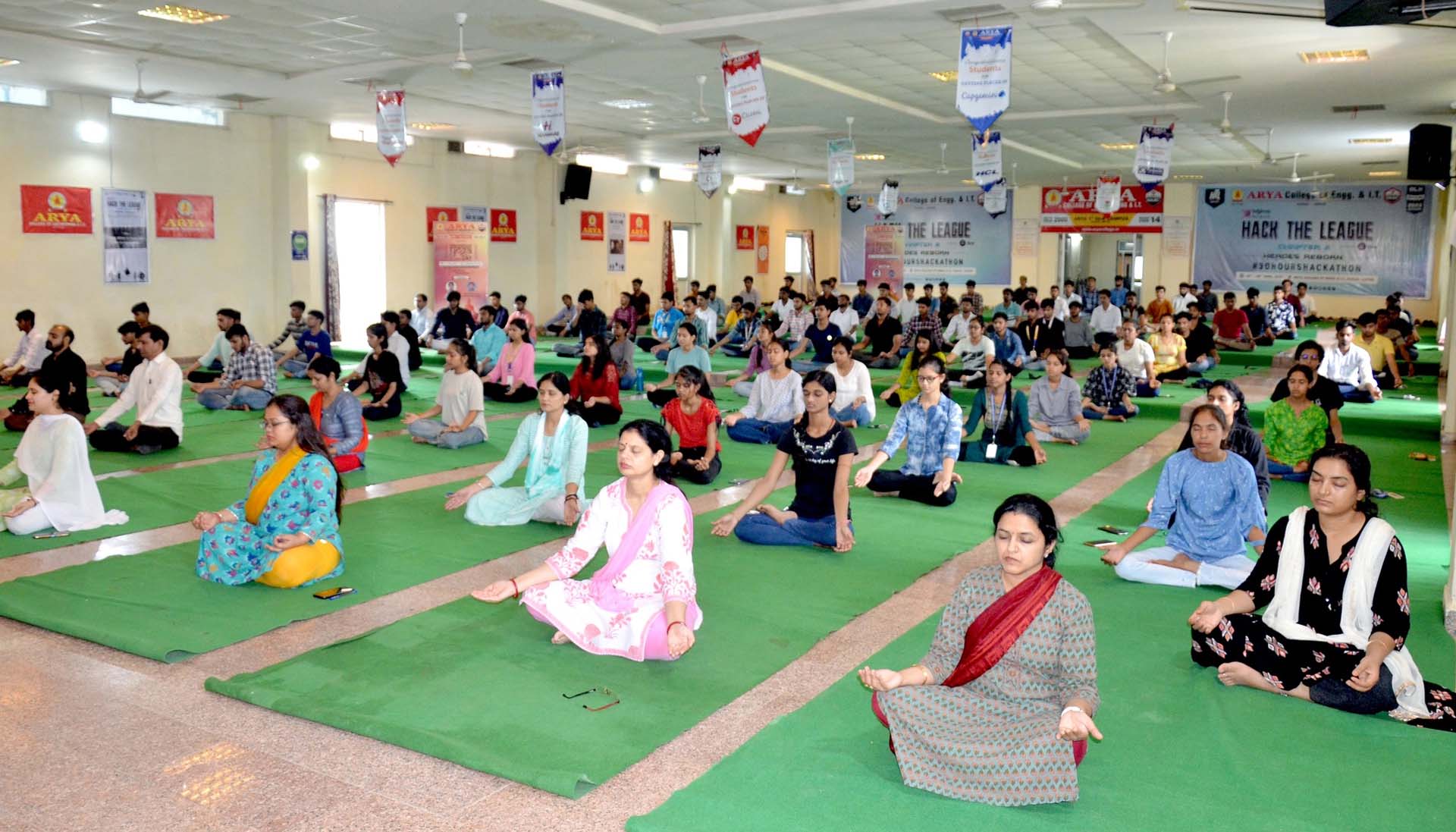 On International Yoga Day 2023, Arya College of Engineering & IT, Jaipur celebrated the occasion with the theme Vasudhaiva Kutumbakam at the Arya 1st Old Campus, 21st June 2023. A special class activity was conducted to raise awareness about yoga and its benefits. Students actively participated, performing various standing yoga postures to improve posture, motor skills, and balance.