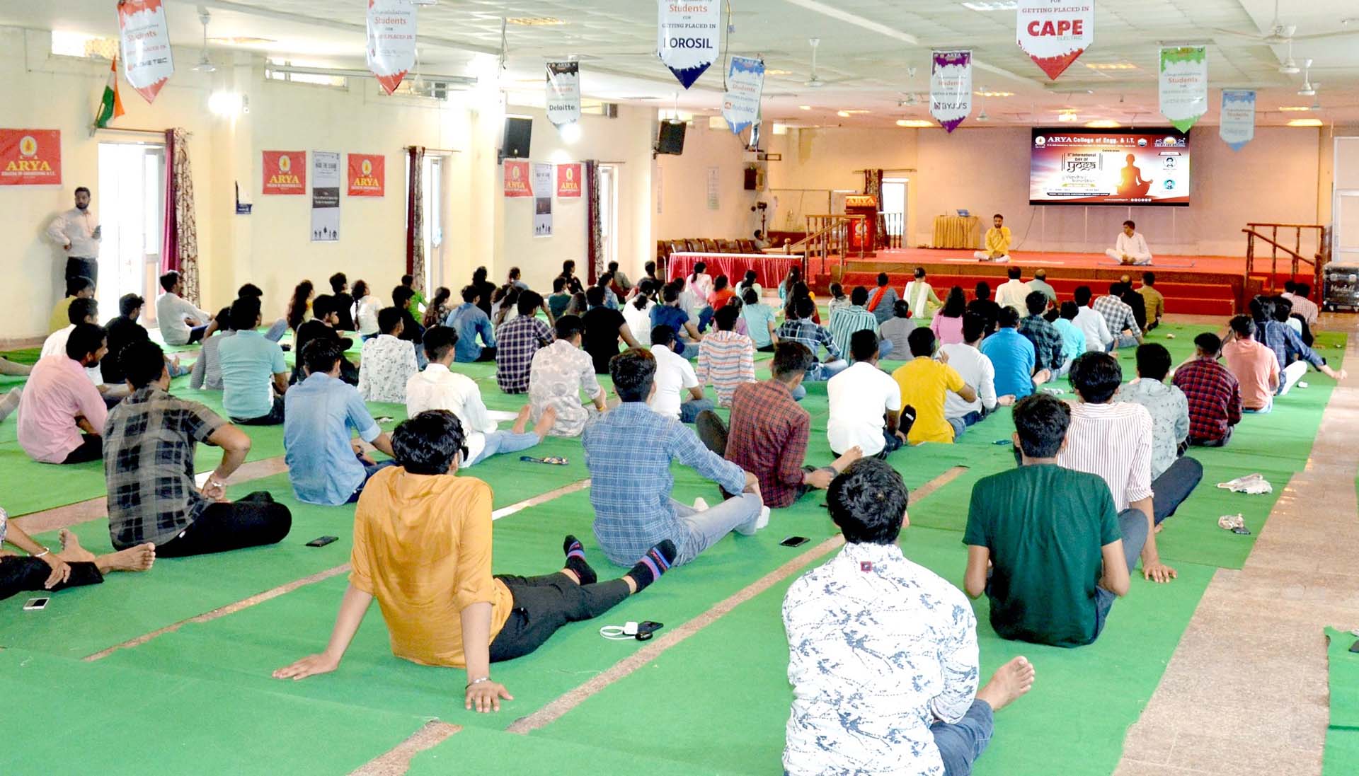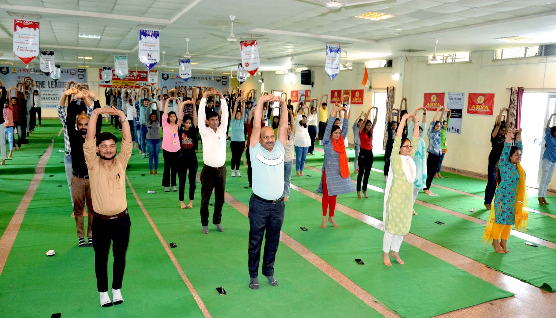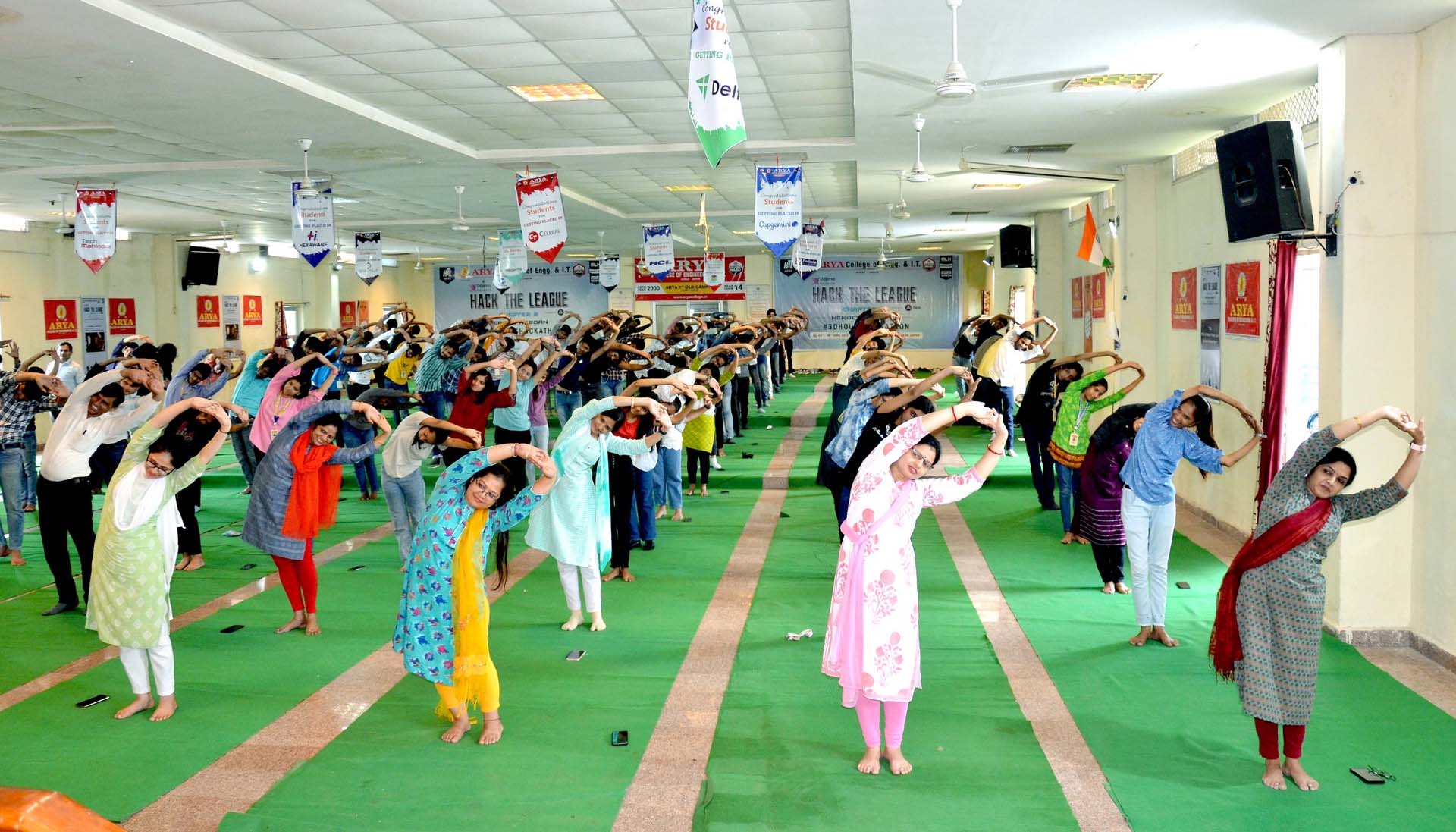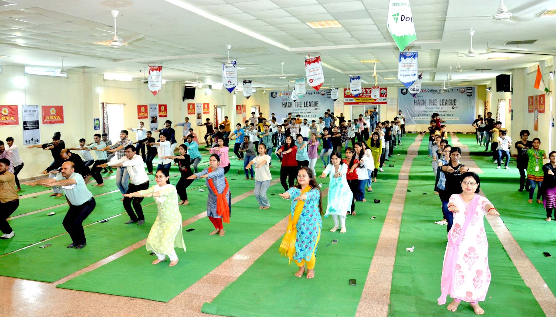 On International Yoga Day 2023, Arya College of Engineering & IT, Jaipur celebrated the occasion with the theme Vasudhaiva Kutumbakam at the Arya 1st Old Campus, 21st June 2023. A special class activity was conducted to raise awareness about yoga and its benefits. Students actively participated, performing various standing yoga postures to improve posture, motor skills, and balance.