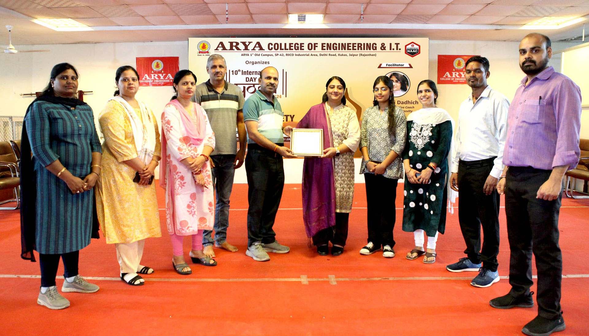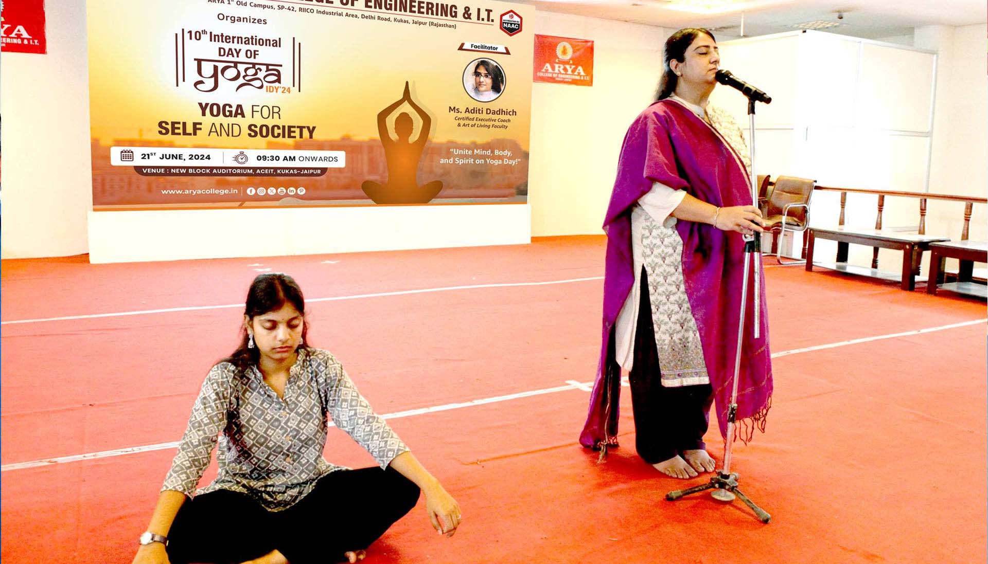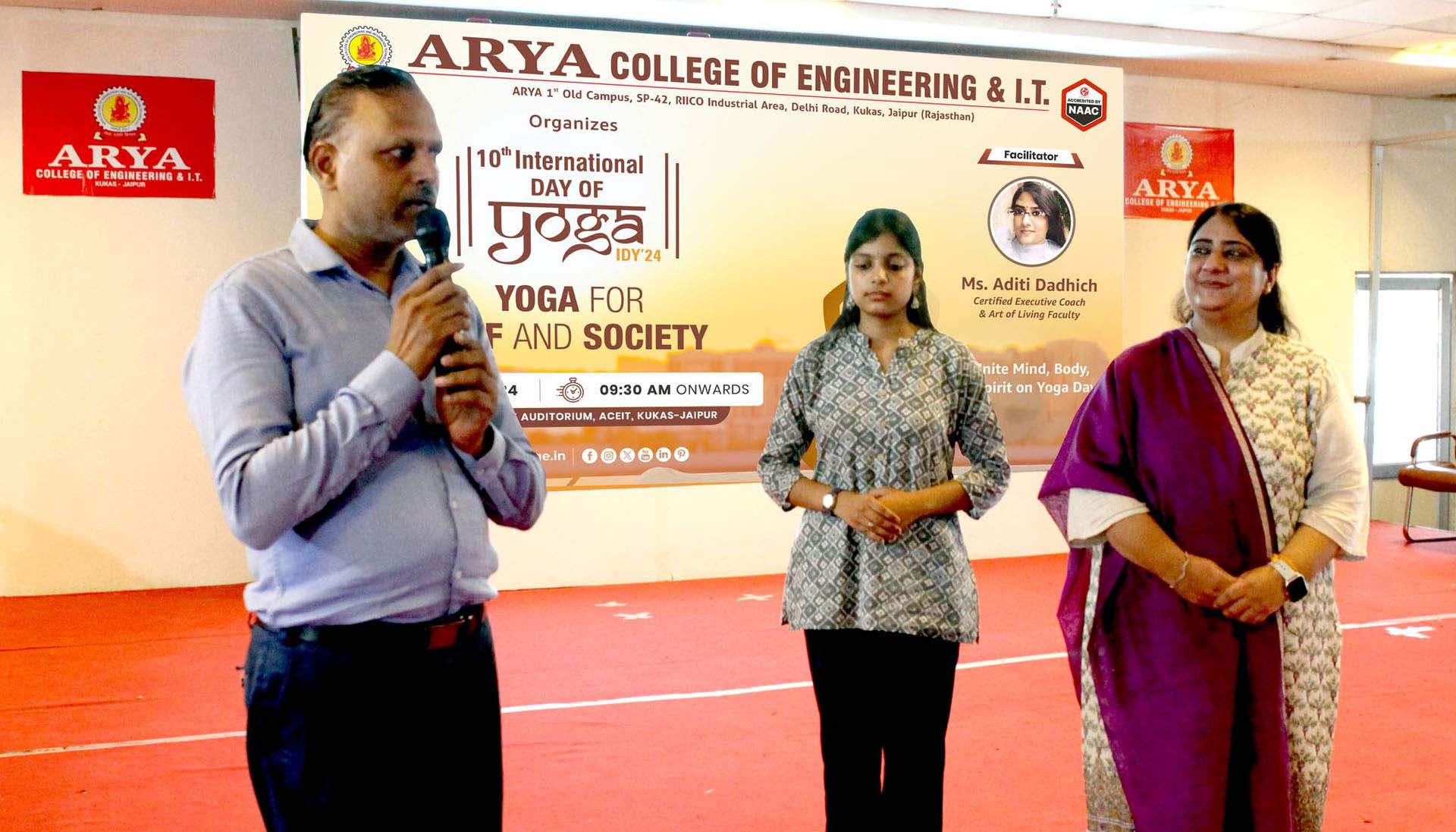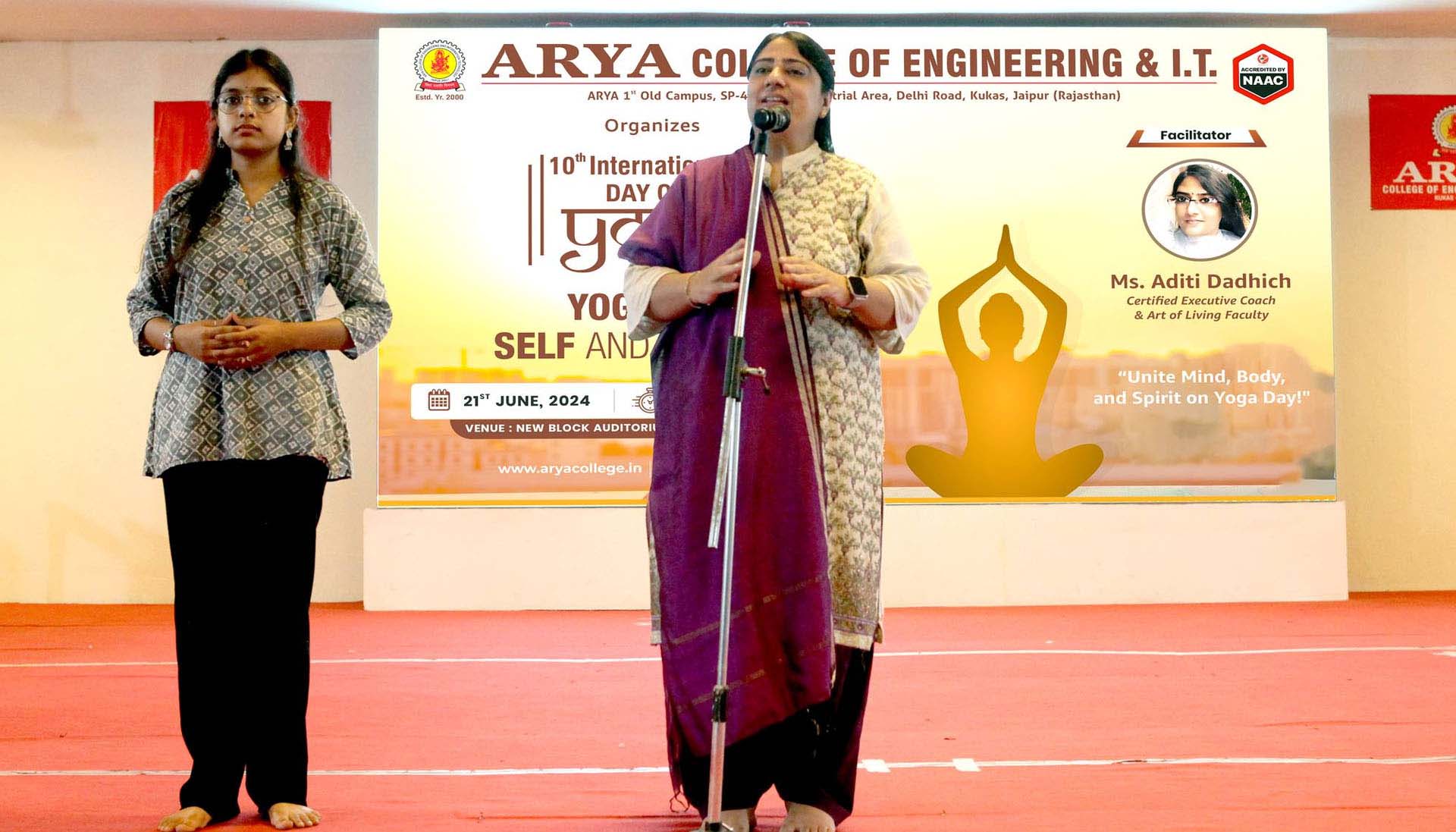 Arya College of Engineering & IT, Jaipur, celebrated the 10th International Day of Yoga with great enthusiasm on June 21, 2024. The event was led by Ms. Aditi Dadhich, a Certified Executive Coach and a distinguished faculty member of the Art of Living. Her expertise and guidance made the session highly engaging and insightful for all attendees.