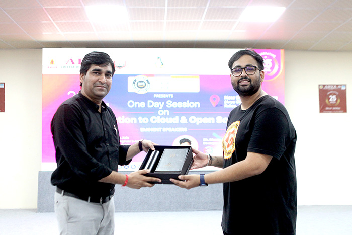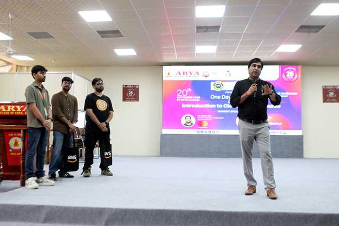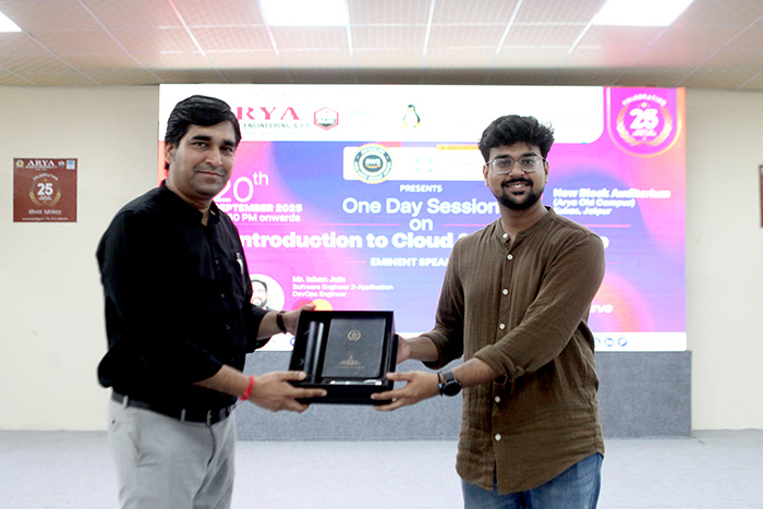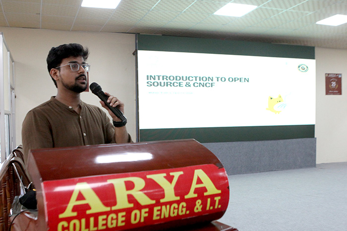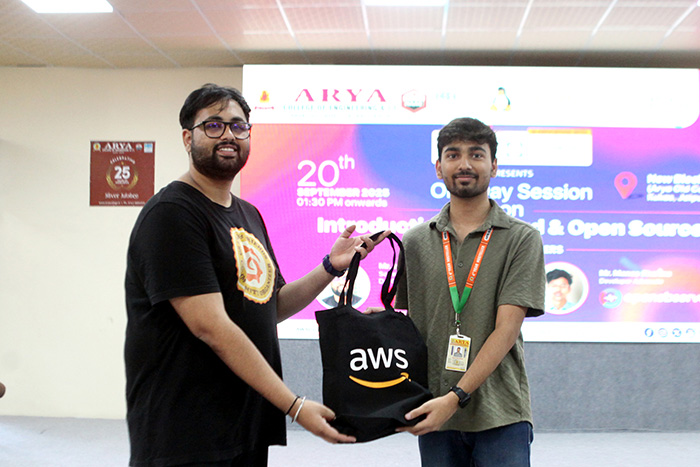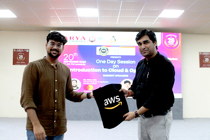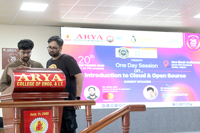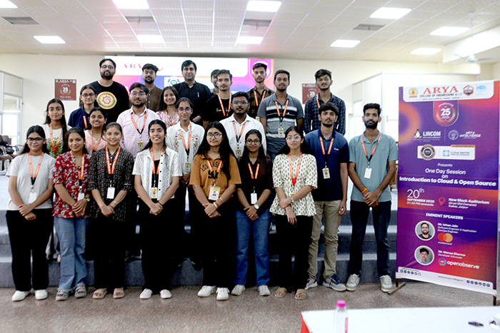 Arya College of Engineering & IT, Jaipur, in collaboration with Arya Lincom Club and Arya Intelverse (AI & IoT Club), and in association with the AWS Users Group Jaipur and the Cloud Native Computing Foundation, successfully organized a hands-on workshop on "Introduction to Cloud & Open Source" on 20th September 2025.