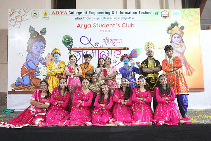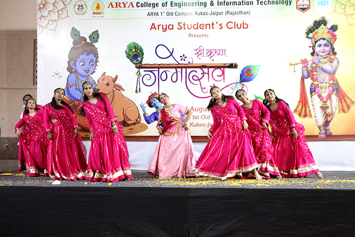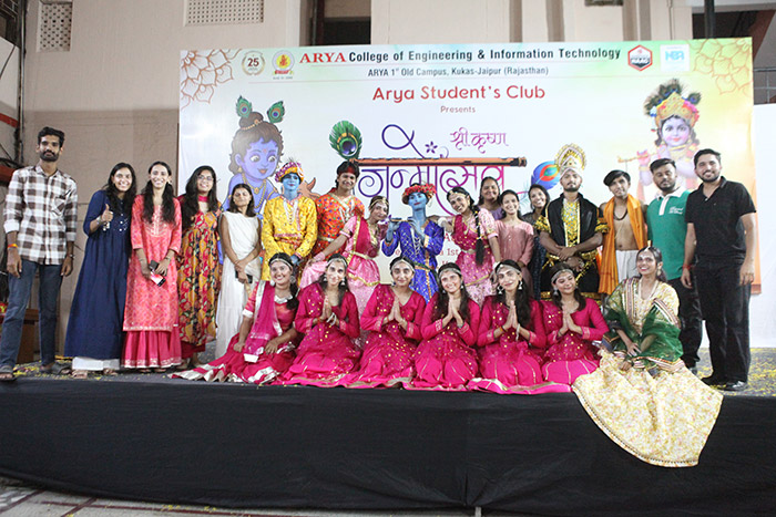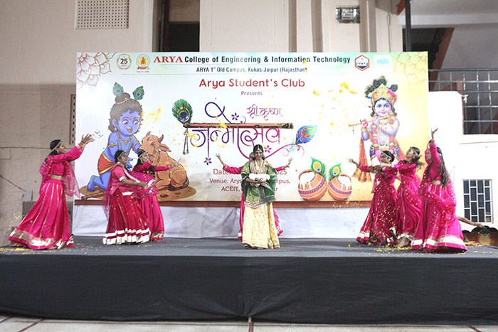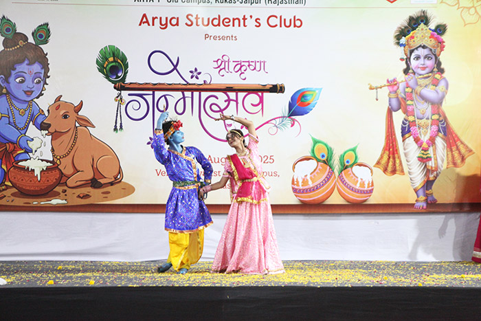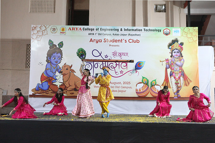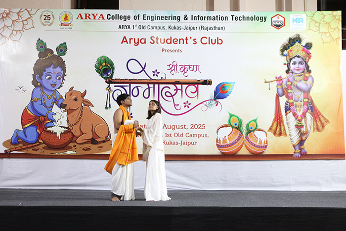 Arya Student’s Club at Arya College of Engineering & IT, Jaipur, joyfully celebrated the auspicious occasion of Krishna Janmashtami on 16th August 2025 with immense devotion, zeal, and festive spirit. The event beautifully reflected the cultural richness of India and the vibrant energy of Arya students, who came together to honor the birth of Lord Krishna in a truly memorable way.