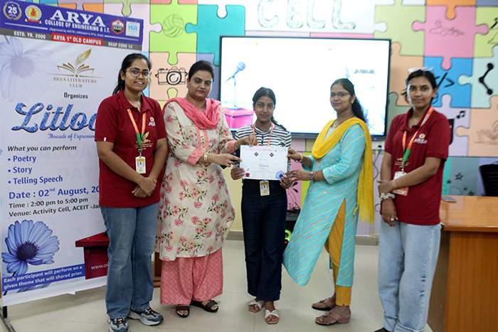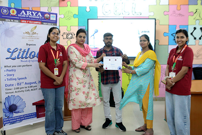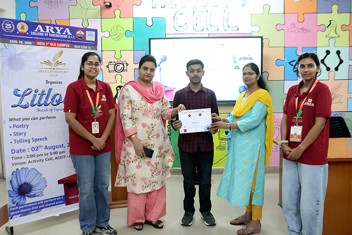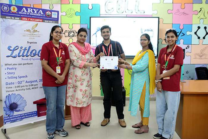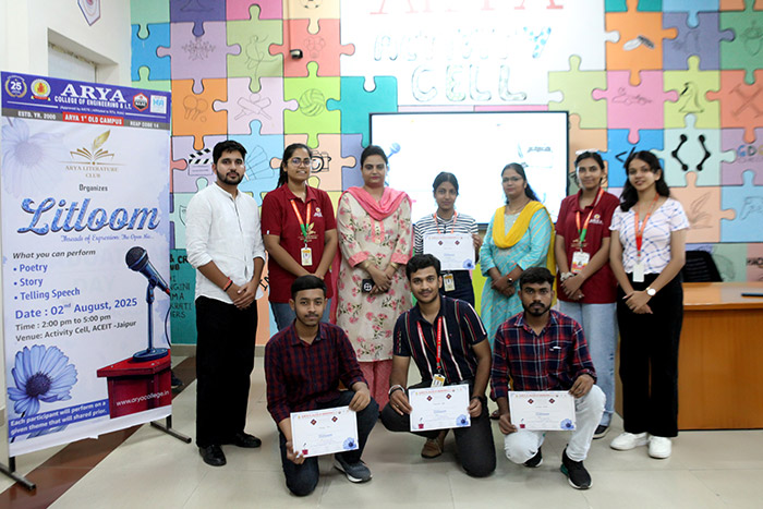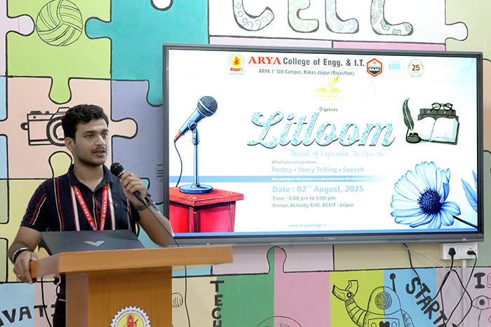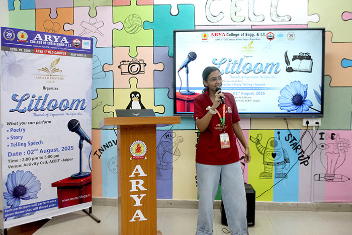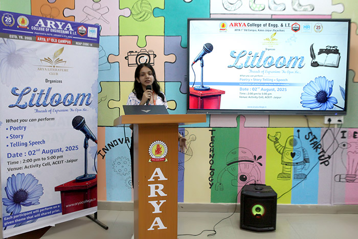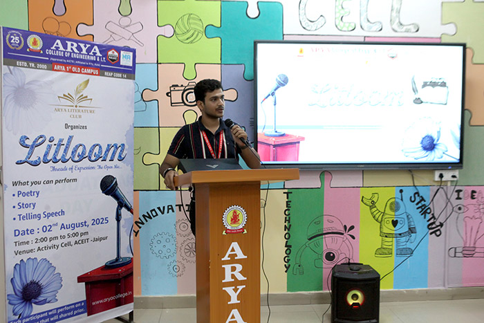 Litloom - The Open Mic, organized by the Arya Literature Club on 2nd August 2025 at the Activity Cell, Arya College of Engineering & IT, Jaipur, turned out to be a lively and engaging celebration of creativity and self-expression. The event served as a dynamic platform for students to showcase their talents in poetry, storytelling, and public speaking. Each performance carried unique emotions, powerful messages, and deep reflections, captivating the audience with heartfelt words and compelling narratives. From soulful verses to gripping stories and confident speeches, the participants illuminated the stage with their literary flair and expressive energy.