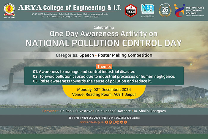 The Institution's Innovation Council at Arya College of Engineering & IT, Jaipur, marked National Pollution Control Day on 2nd December 2024 by organizing a one-day awareness activity session. The event focused on raising awareness about pollution control and promoting environmental sustainability among students.