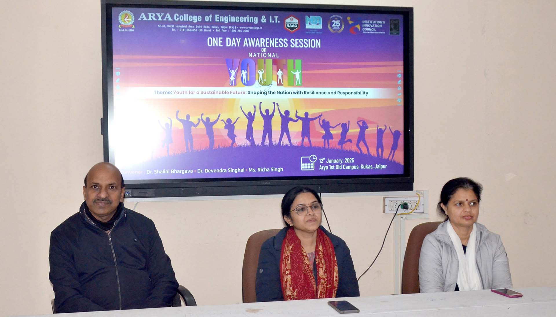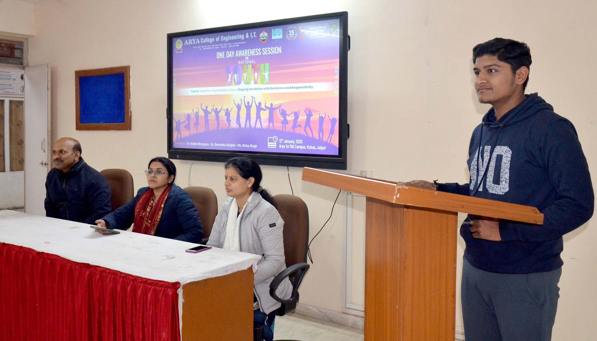 The Institution's Innovation Council at Arya College of Engineering & IT, Jaipur, celebrated National Youth Day by honoring the teachings and ideals of Swami Vivekananda through an impactful one-day awareness session. The event, themed "Youth for a Sustainable Future: Shaping the Nation with Resilience and Responsibility," emphasized the crucial role of young minds in tackling sustainability challenges and fostering national resilience. Through interactive discussions and thought-provoking sessions, students explored innovative solutions to environmental and societal issues, reinforcing the importance of responsibility and leadership.
