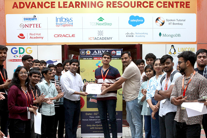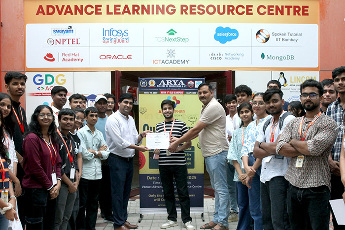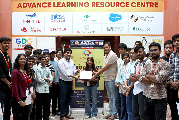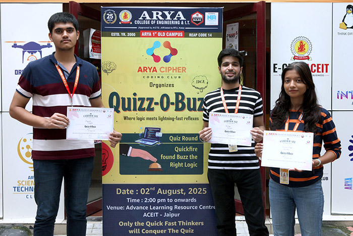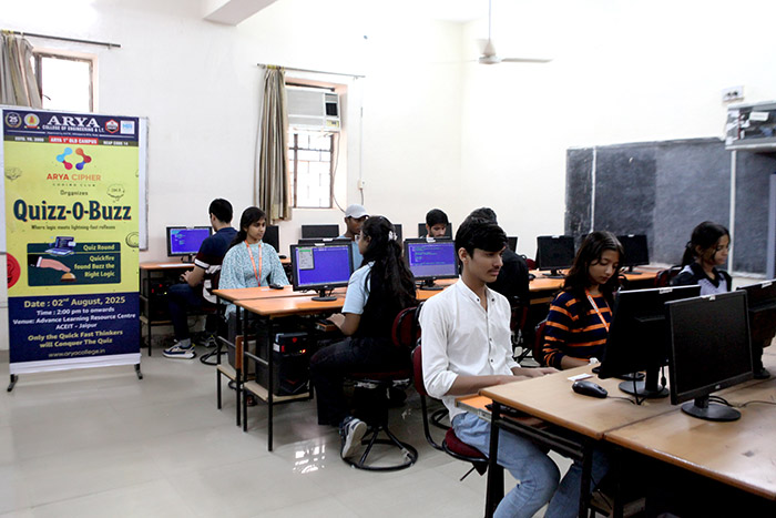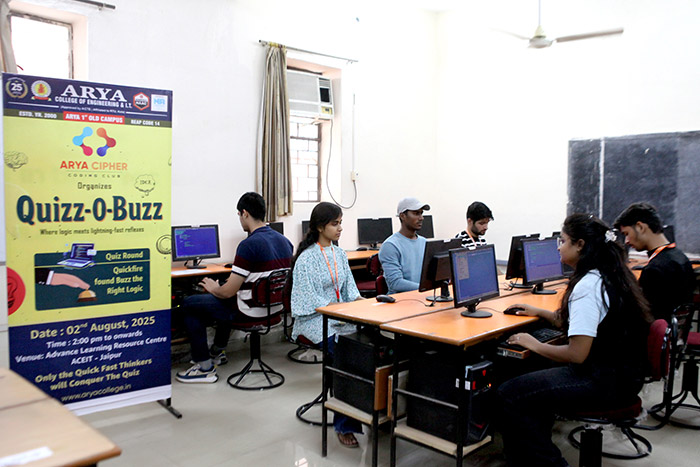 The Arya Cipher Coding Club proudly organized Quizz-O-Buzz on 2nd August 2025 at the Advance Learning Resource Centre, Arya College of Engineering & IT, Jaipur. This intellectually charged event was designed to test students’ logical reasoning, technical knowledge, and presence of mind through a thrilling quiz format.