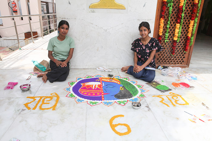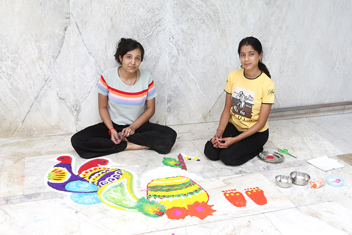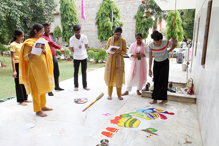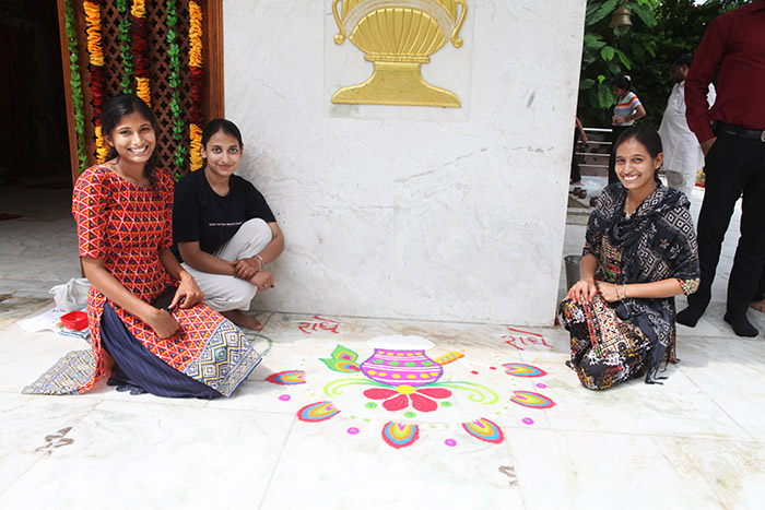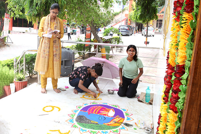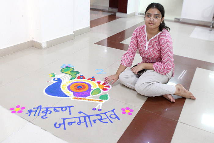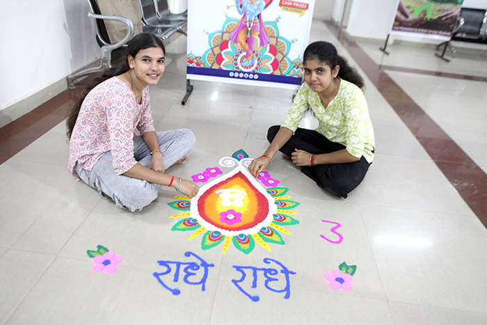 The event witnessed enthusiastic participation from students who poured their hearts into creating stunning rangoli designs inspired by the life, teachings, and symbols of Lord Krishna. Using vibrant colors, flowers, and creative patterns, the participants transformed the campus corridors into a canvas of devotion, joy, and artistry. Each rangoli reflected not only artistic talent but also deep cultural values, spreading positivity and festive energy throughout the college.