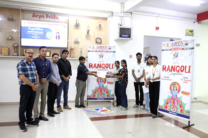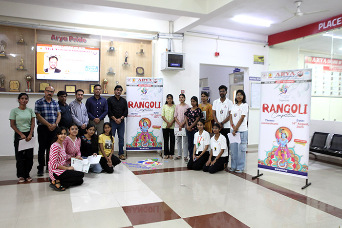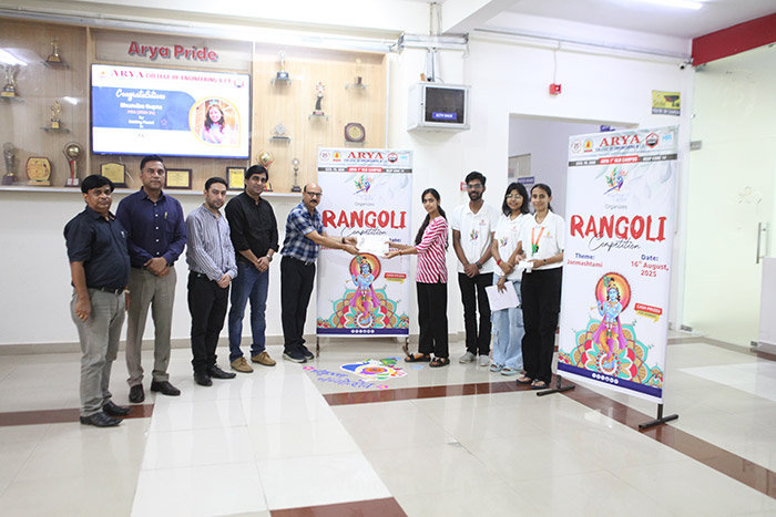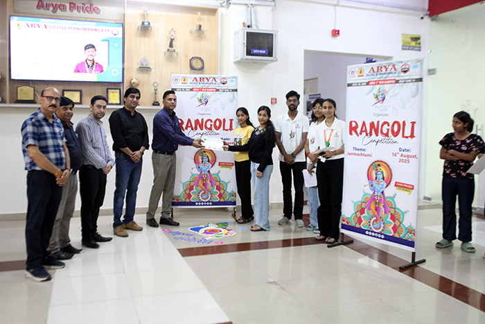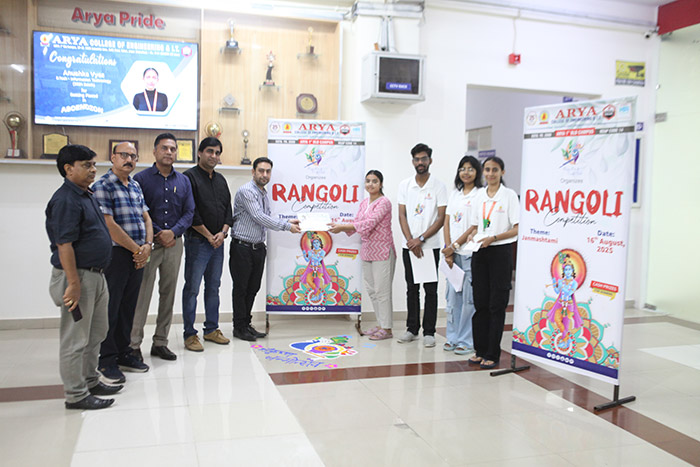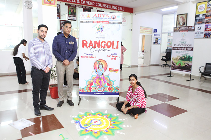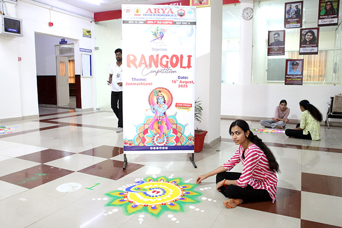 On the auspicious occasion of Janmashtami, celebrated on 16th August 2025, the Arya Art & Craft Club at Arya College of Engineering & IT, Jaipur, organized a lively and colorful Rangoli Competition that brought festive charm and cultural vibrancy to the campus.