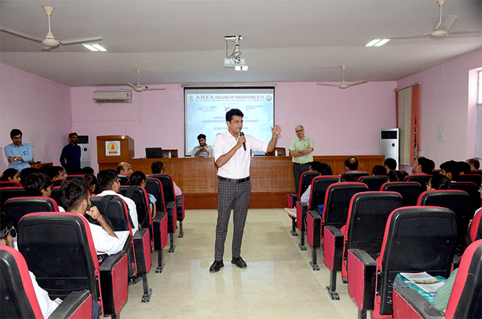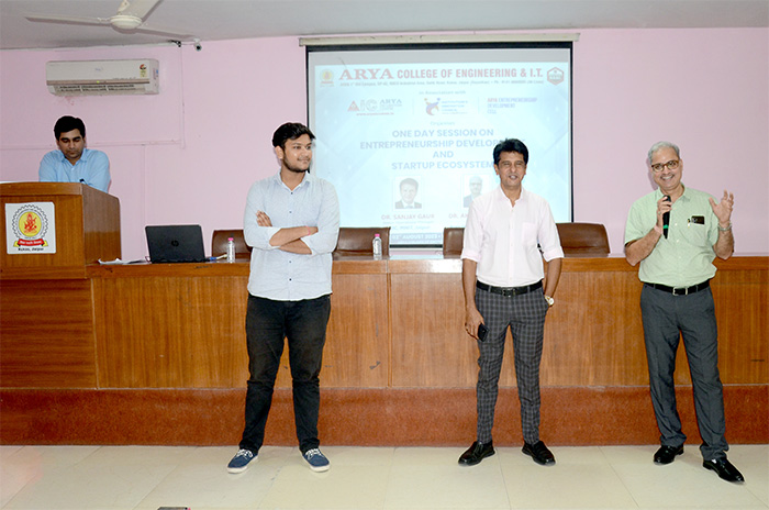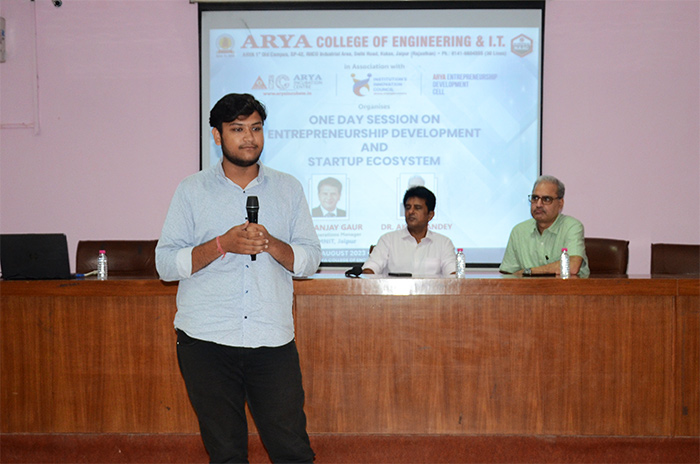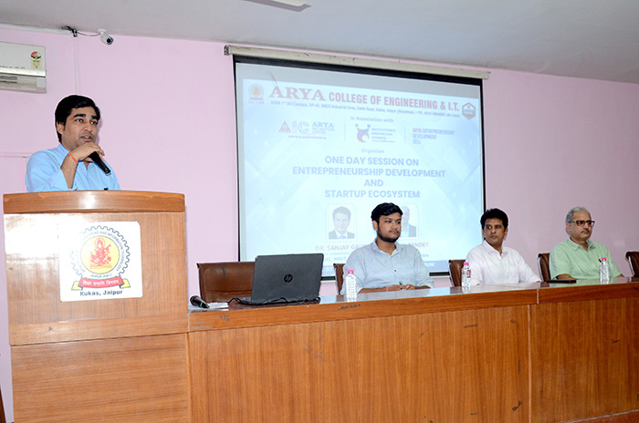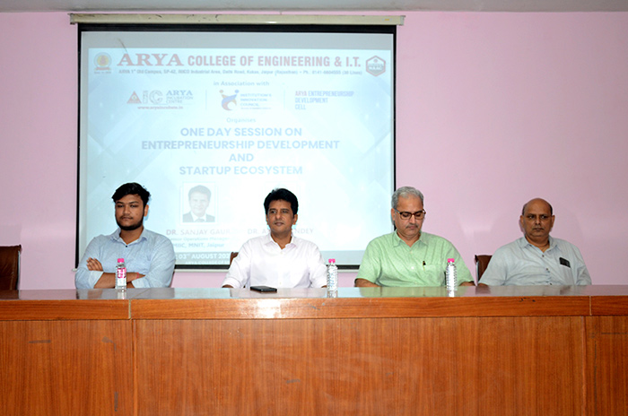 Arya College of Engineering & IT, Jaipur in association with Arya Incubation Centre, Institution's Innovation Council & Arya Entrepreneurship Development Cell Organized One Day Session on Entrepreneurship Development and Start-up Ecosystem on 3rd August, 2023. The session was delivered by Dr. Sanjay Gaur, Senior Operations Manager, MIIC, MNIT, Jaipur. This session was really informative & helpful for the students. ACEIT, Jaipur takes pride in fostering an entrepreneurial spirit among its students and promoting innovation in the academic community. The session aimed to provide valuable insights into the world of entrepreneurship, equip aspiring entrepreneurs with essential skills, and showcase the vibrant start-up ecosystem that awaits them beyond the academic realm.