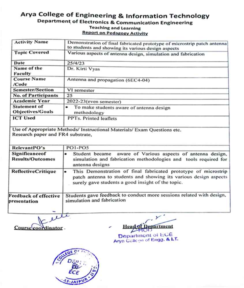 The instructional materials and pedagogy activity reports are uploaded under the tab “TEACHING AND LEARNING” on the institutional website (Link: https://www.aryacollege.in/electronics-and-communication-engineering).